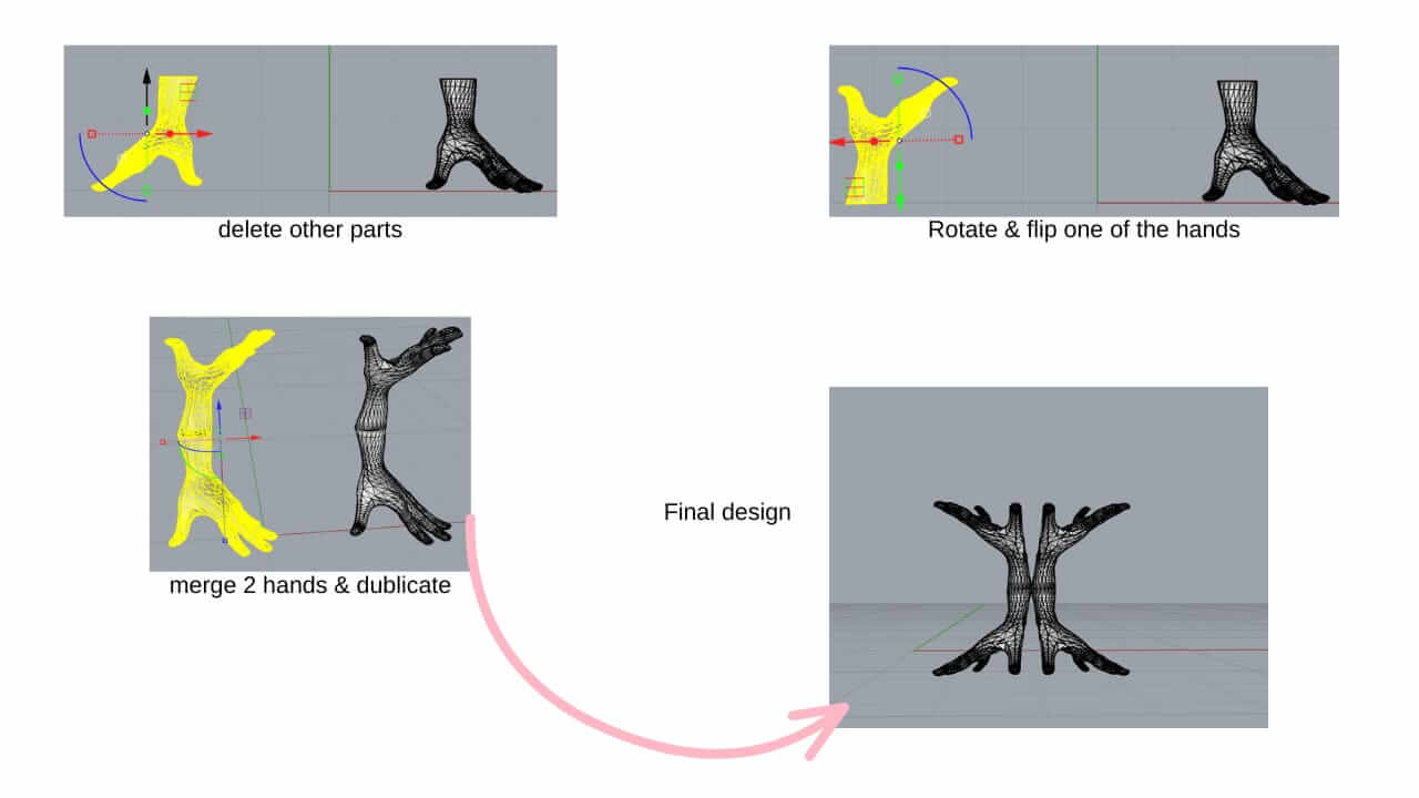 Then I started transforming the hand into the design I wanted,after rotation and aligning the hands at the desired level, I merged them using the command MeshBooleanUnion, so they became one object.