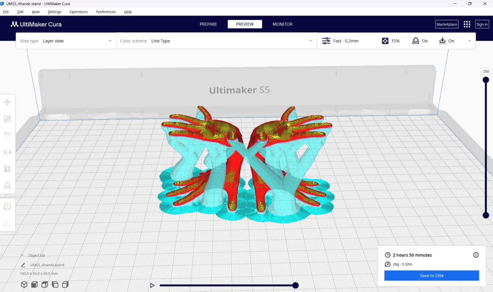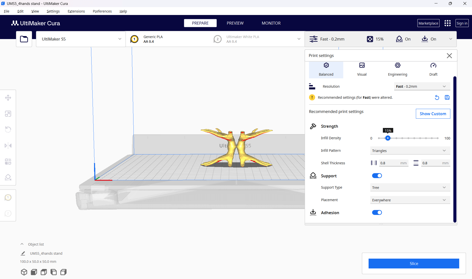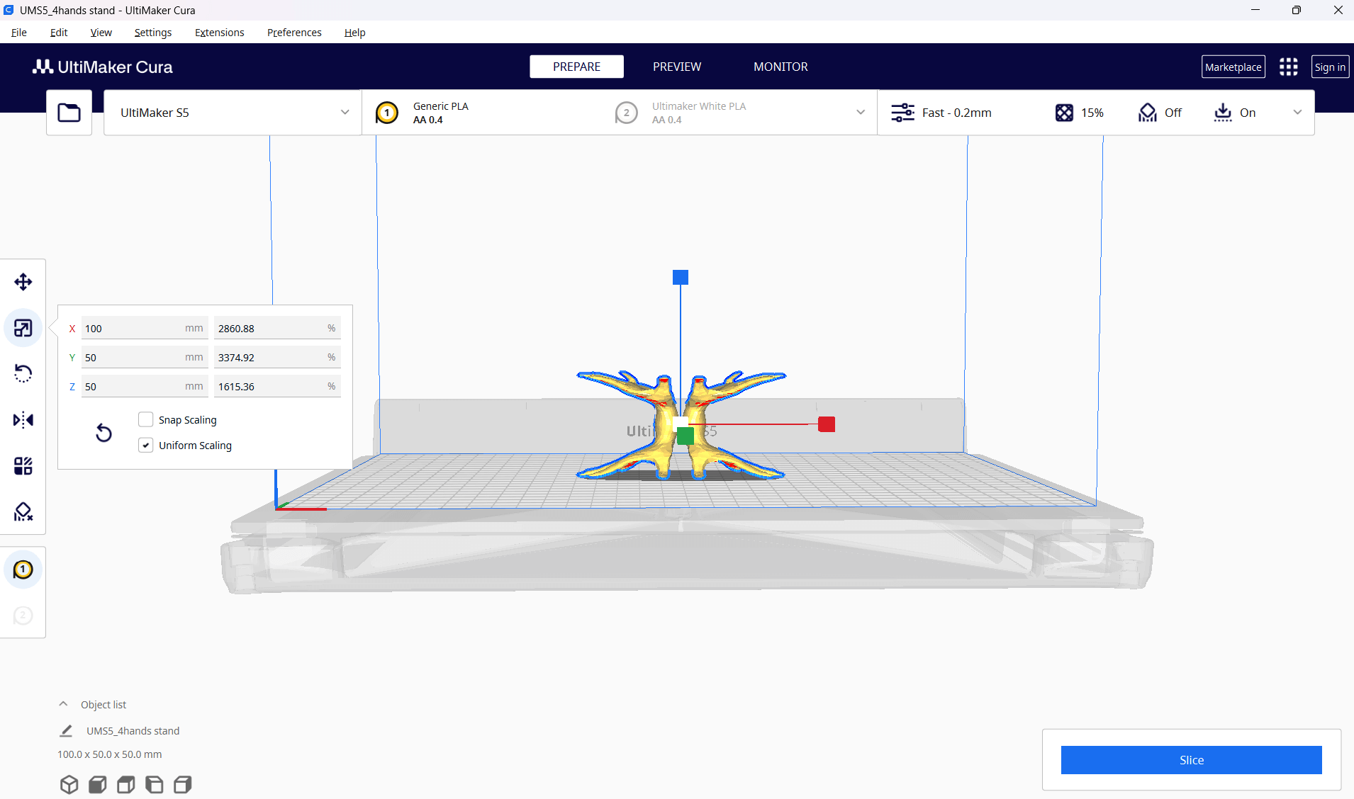 After preparing and completing the design I wanted, I exported the file in STL format and moved it to the Ultimaker Cura software to prepare it for 3D printing.