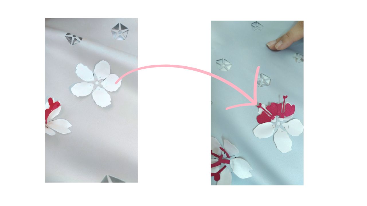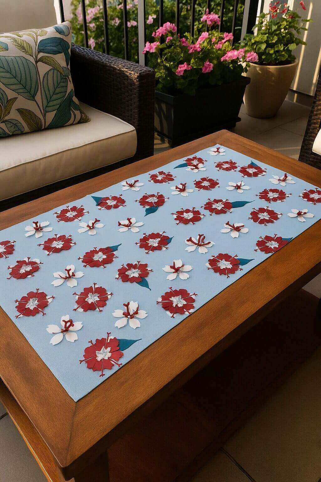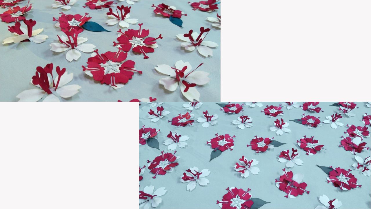 The tablecloth is constructed using an interlocking technique of laser-cut modules, each mimicking the shape of a simplified cherry blossom that interlocks with adjacent modules to create a cohesive and balanced fabric. This modular system reflects the harmony between nature and geometric organization, where organic decoration blends with modern technology to produce a functional aesthetic.
