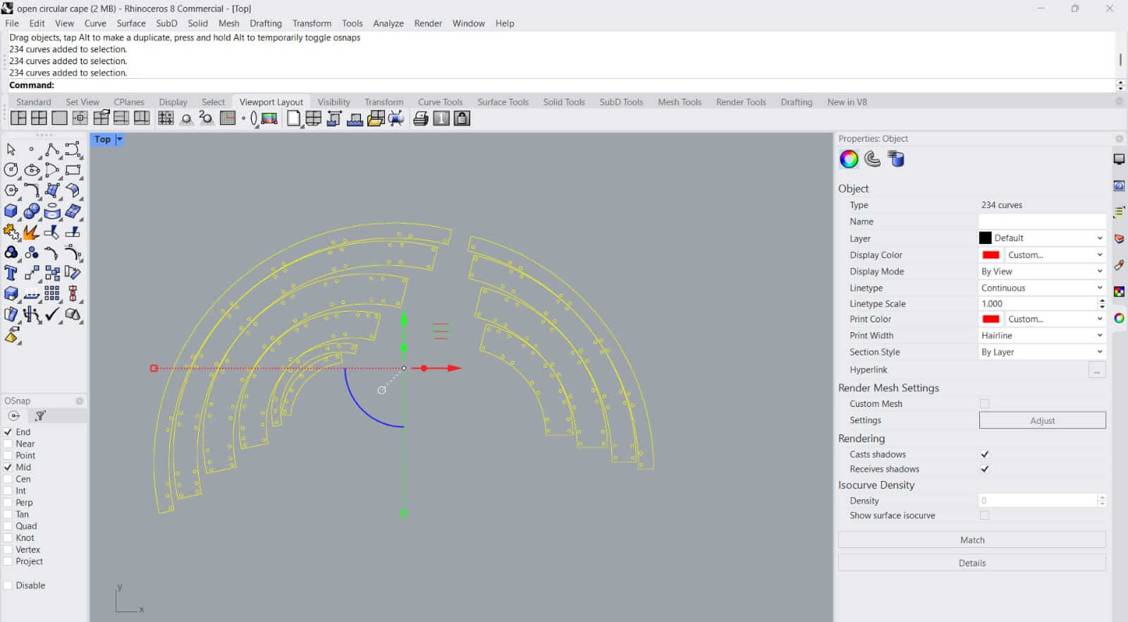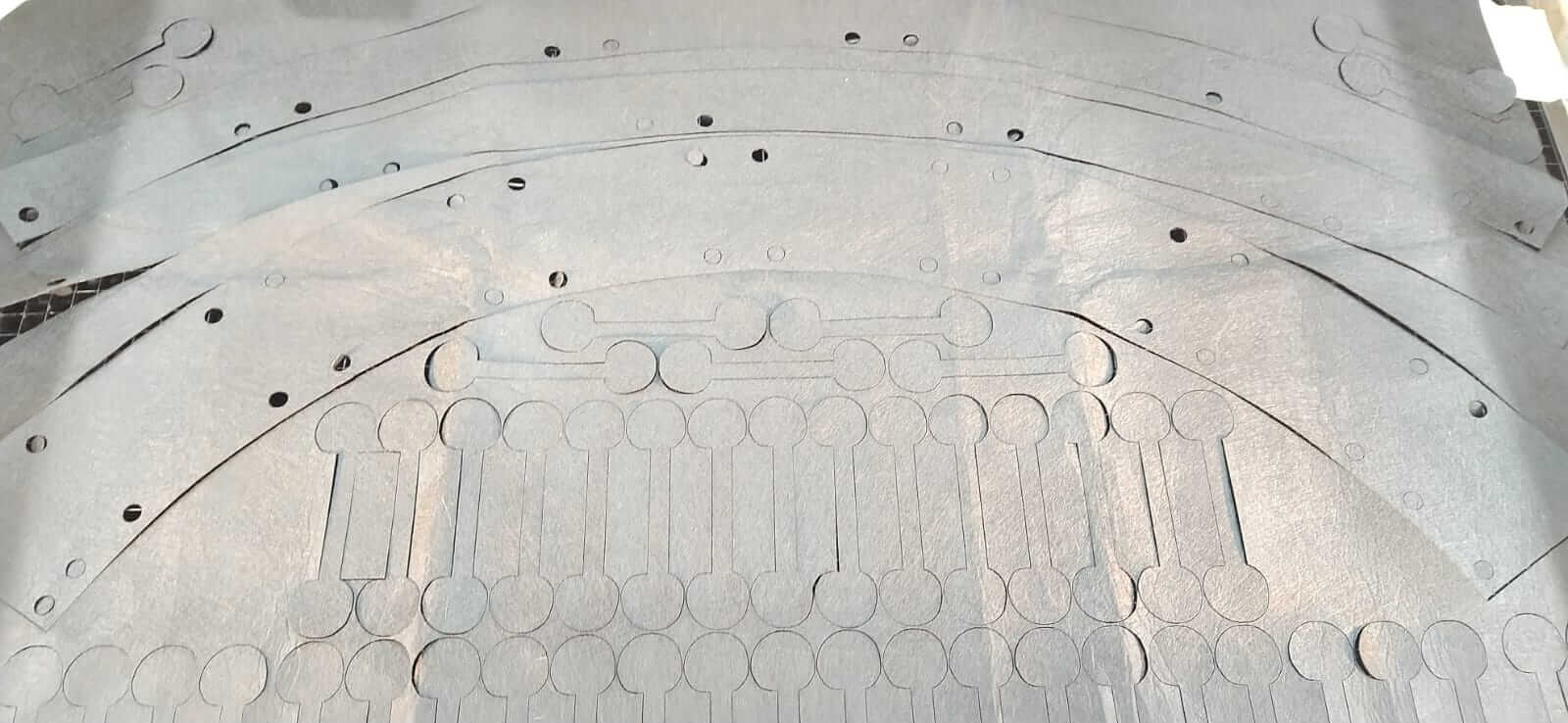 I drew a pattern for cutting the cap using the Rhino software, by drawing several circles, cutting out quarter circles and adding small circles as holes for the interlocking system.