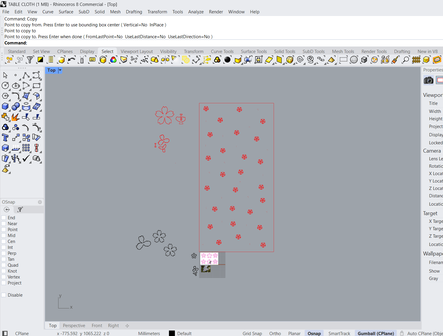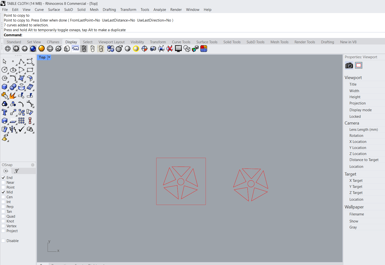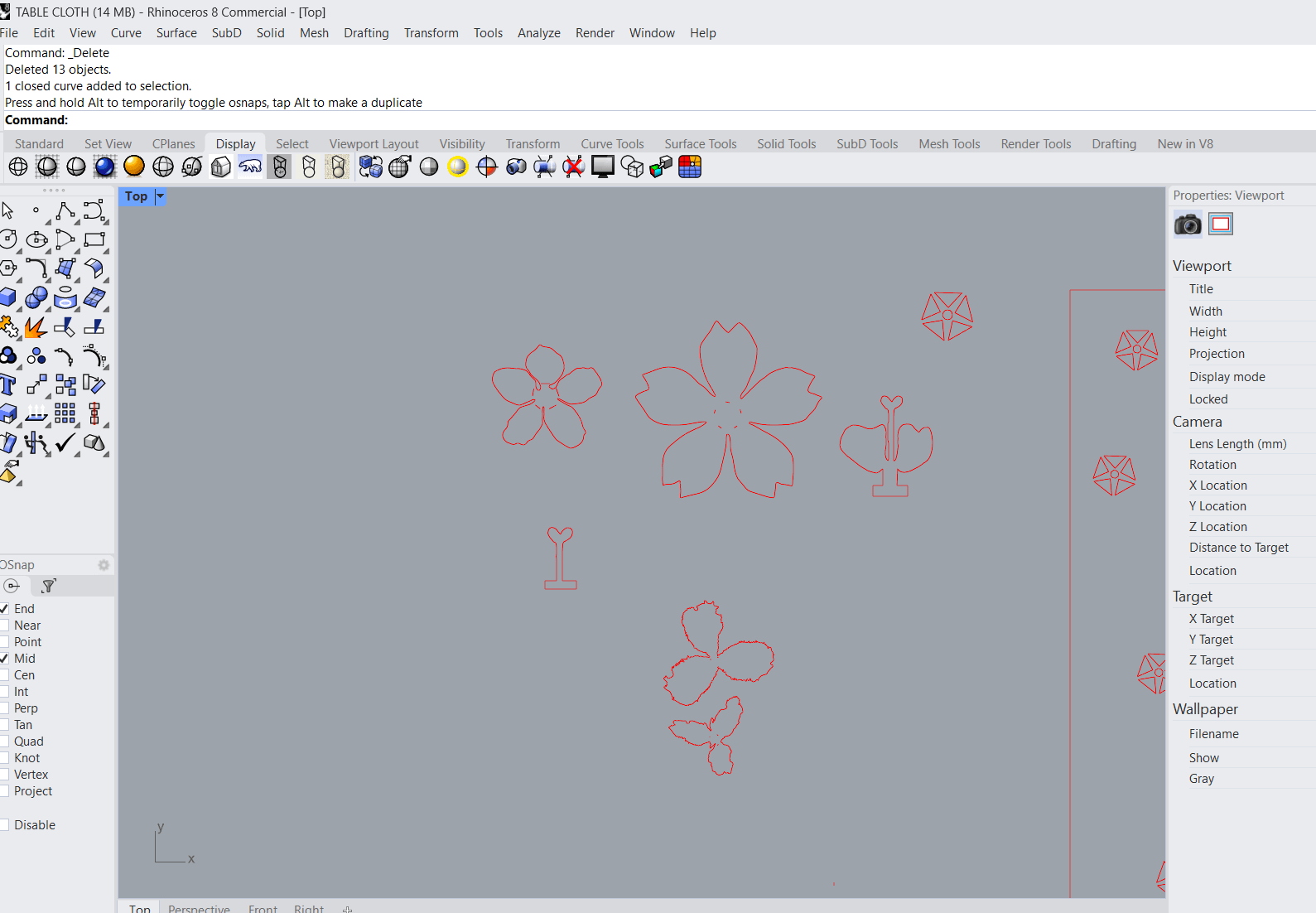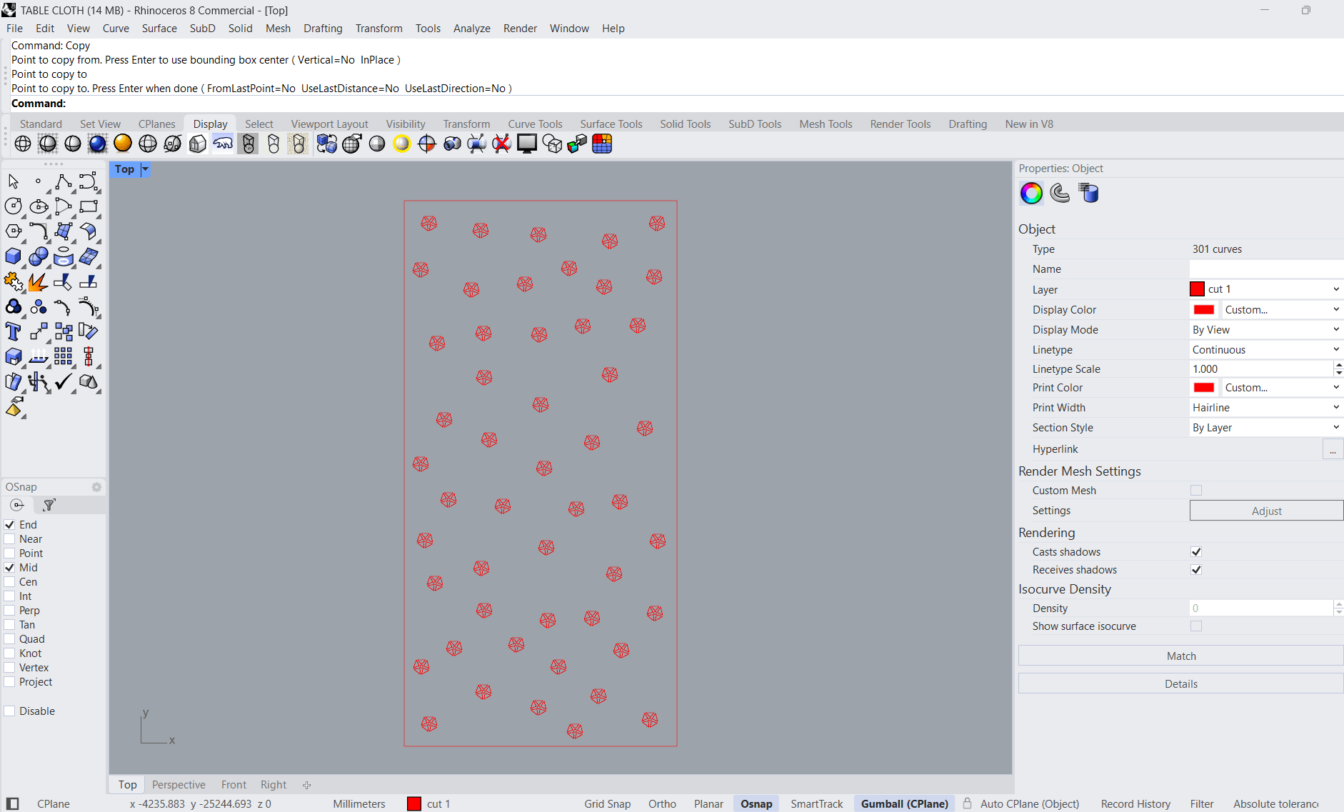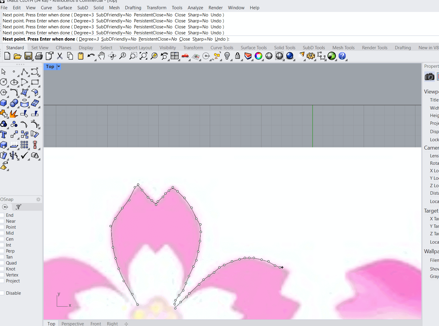 I started this design with drawing thae table cloth itself usinhg RHINO, then I draw the spaces for the flowers interlocks.