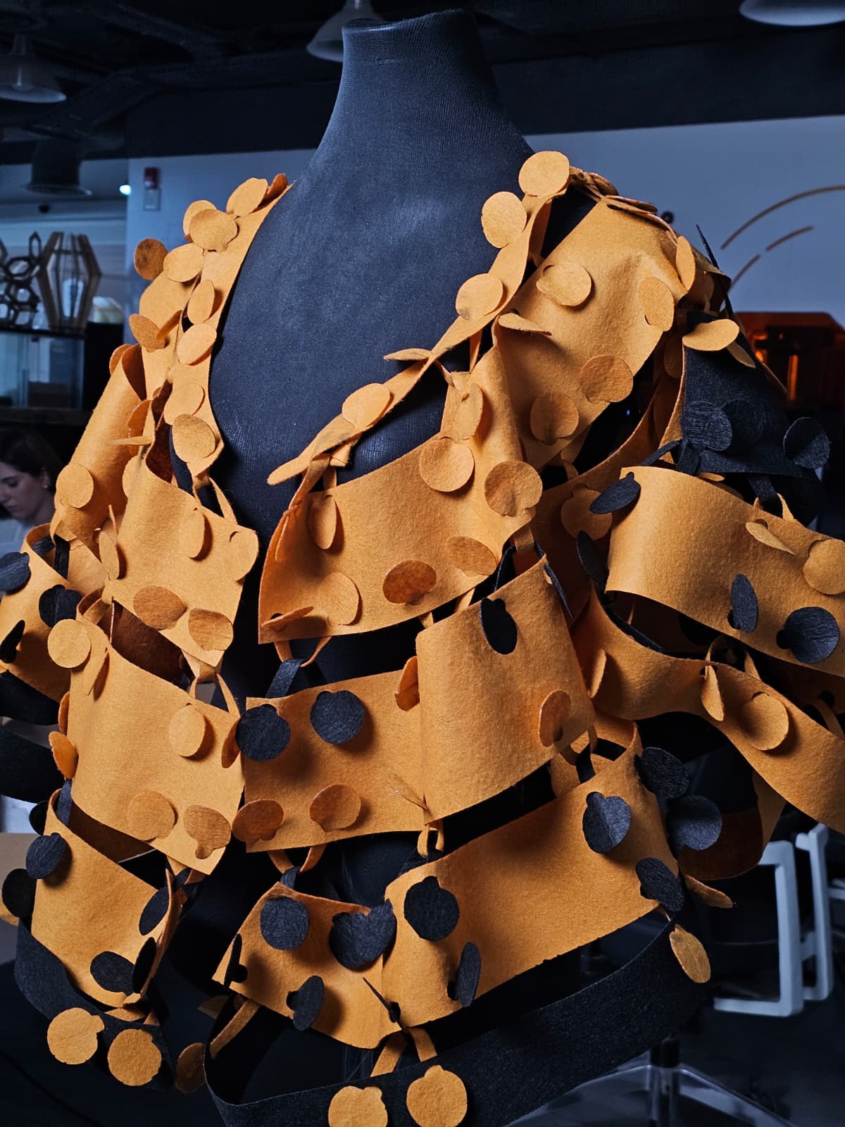 For this design, the circular rhythm and layered flow of traditional crochet patterns are reinterpreted through laser-cut units interwoven with precise geometric patterns, replacing hand-threaded stitches with interlocking links. Each unit in the laser-cut pattern mimics the organic repetition found in crochet stitches and cherry clusters, forming a structural fabric that combines the precision of digital technology with the feel of handcraft.