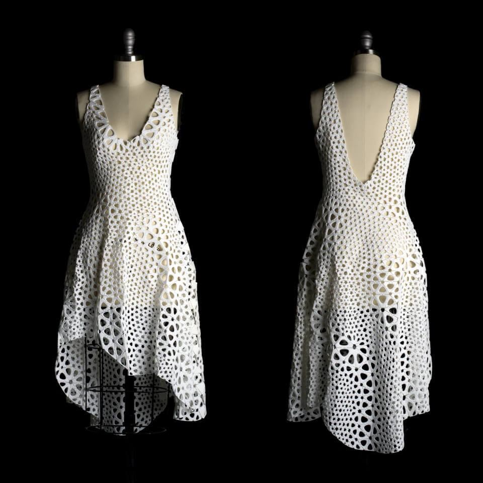 The dress is composed of small, interconnected units that move freely to fit the body.