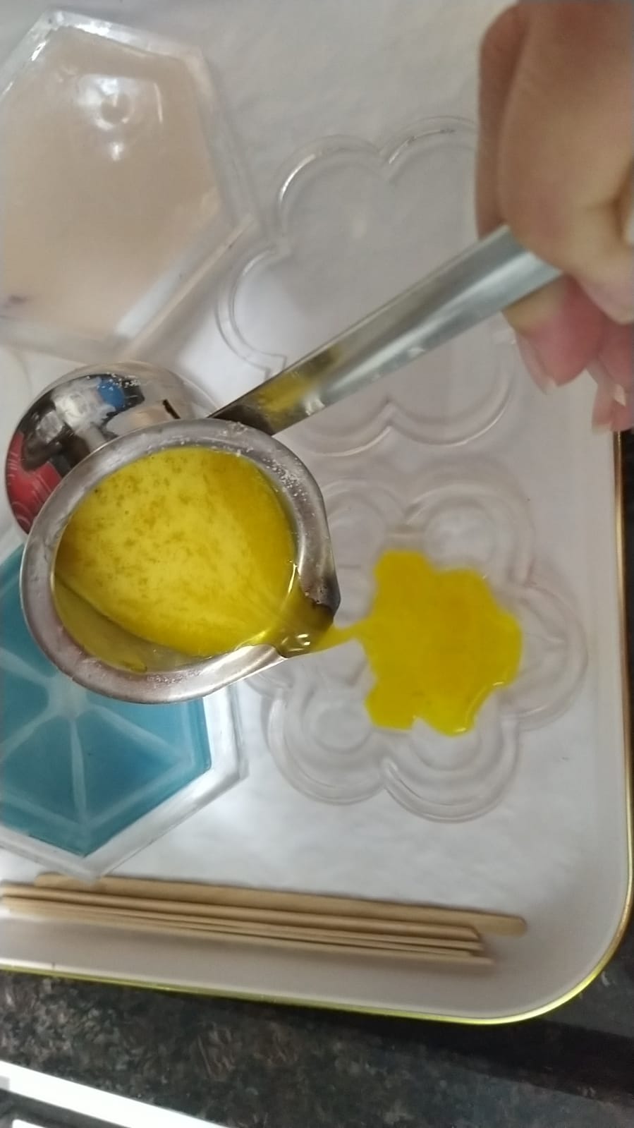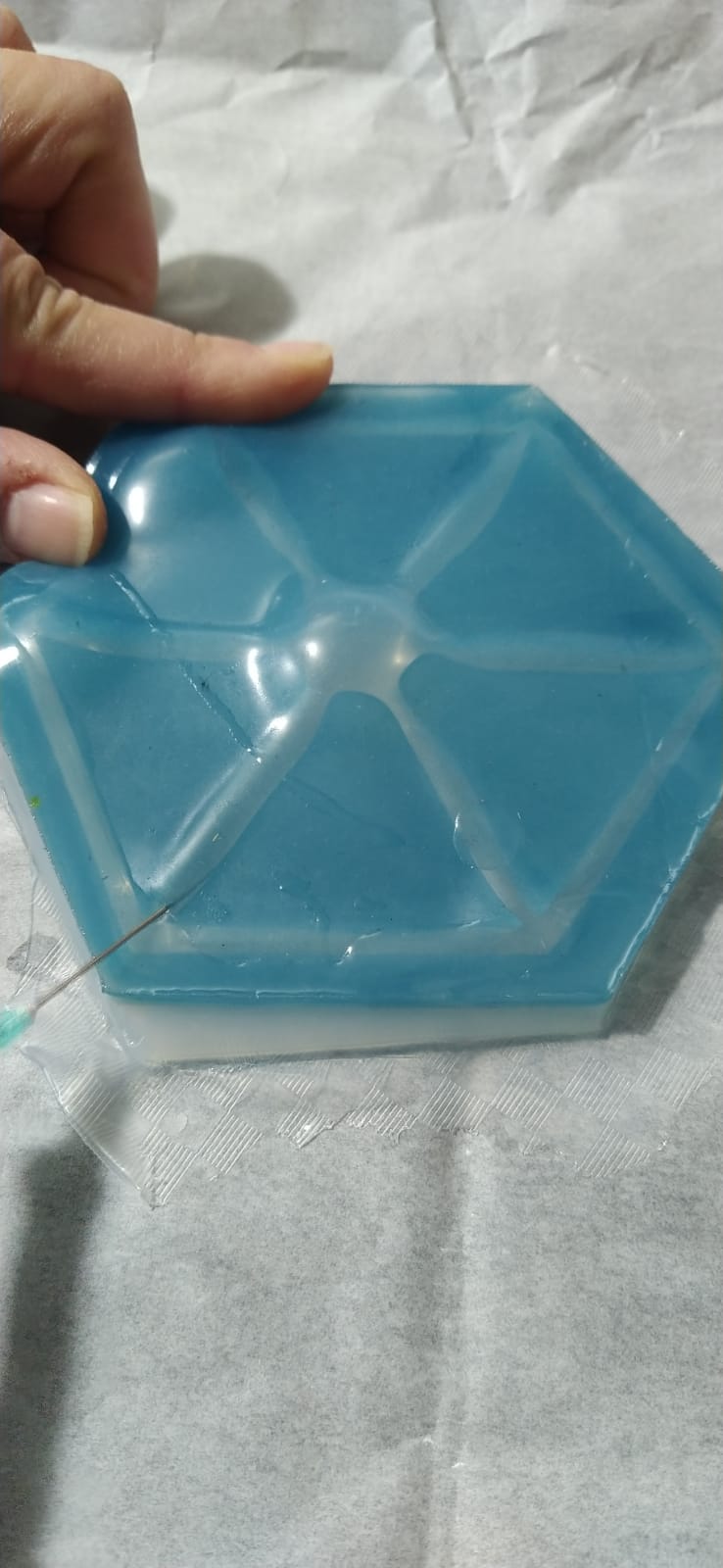 after mix the pigment with the silicon I poured the silicone to the mold taking into account that the pouring should be done in the middle of the mold, and trying to keep your hand away from it as far as possible.