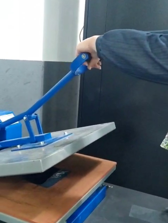 After cutting two sheets of vinyl and but the baking paper between them then we We press it using a heat press.