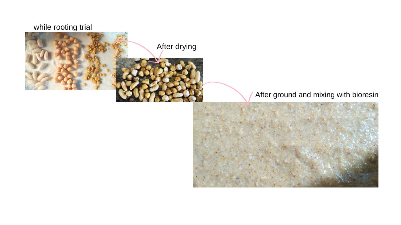 After trying to rooting these beans I found that it will take very long time, so I dried and ground all the beans together, then I mixed the powder with bioresin.