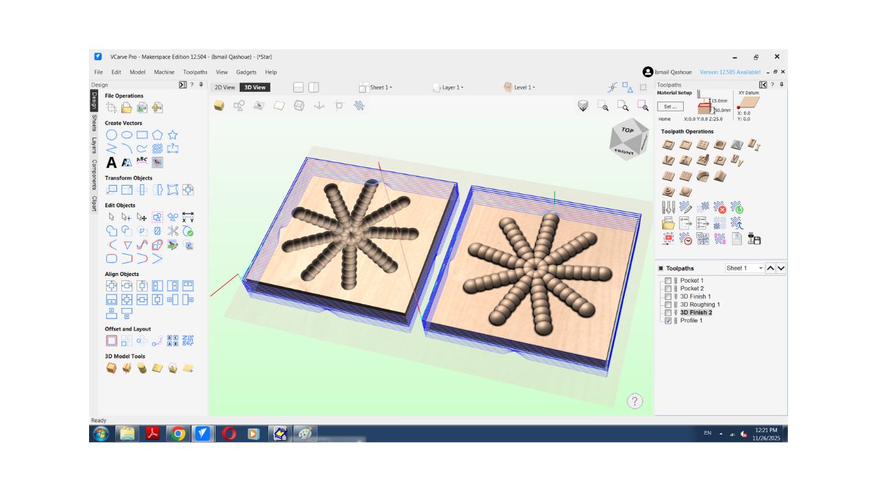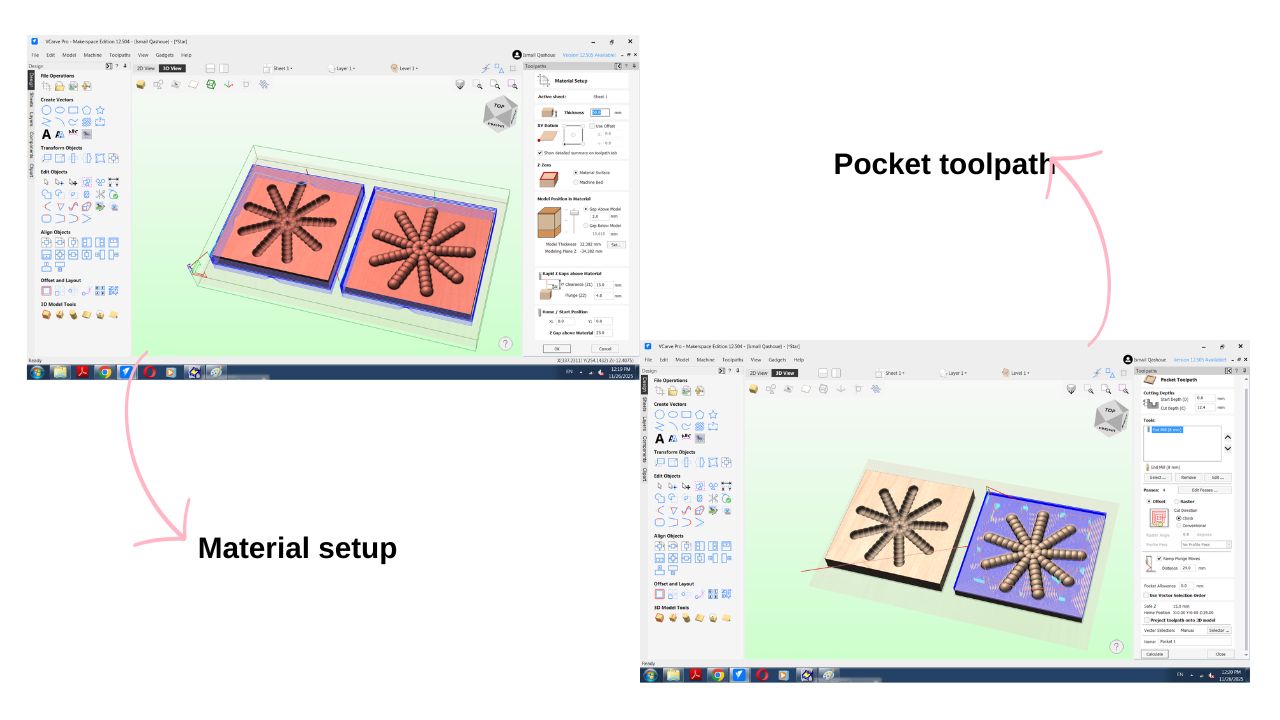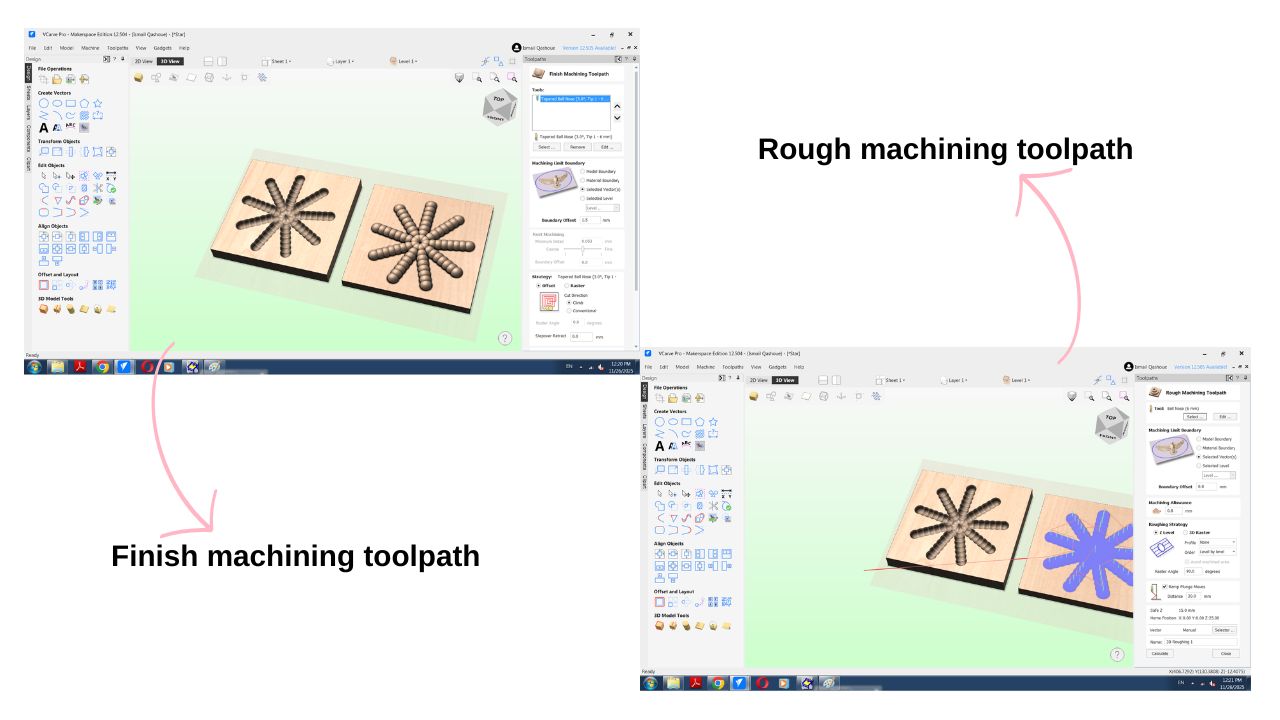 After using one of designin softwares like Rhino, we safe the file in Stl format. Then we start using other software which is common used with CNC machines VCarve Pro