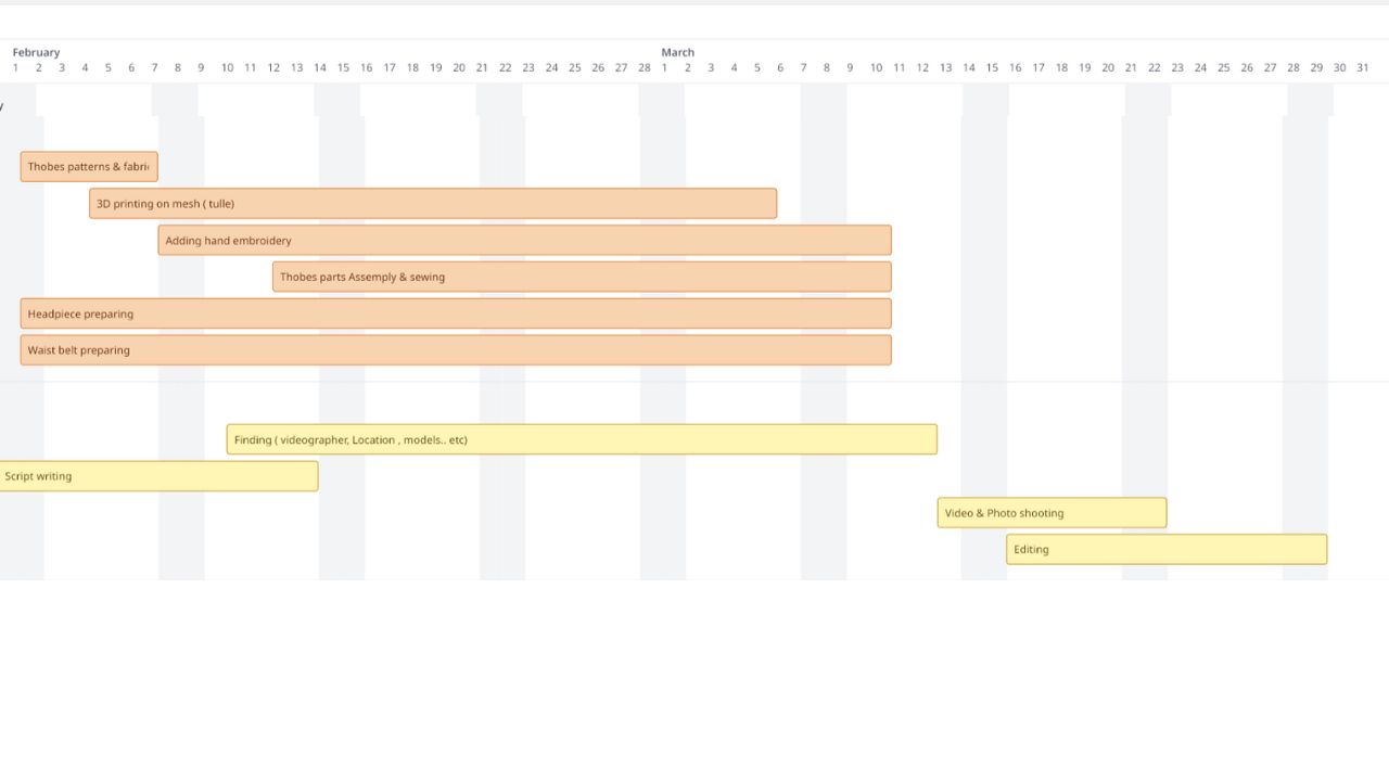 The following is a timeline of tasks and activities, showing the sequence of work, the duration of each task, and points of overlap or parallelism between them, which helps to organize the project, monitor progress, and manage time and resources efficiently.