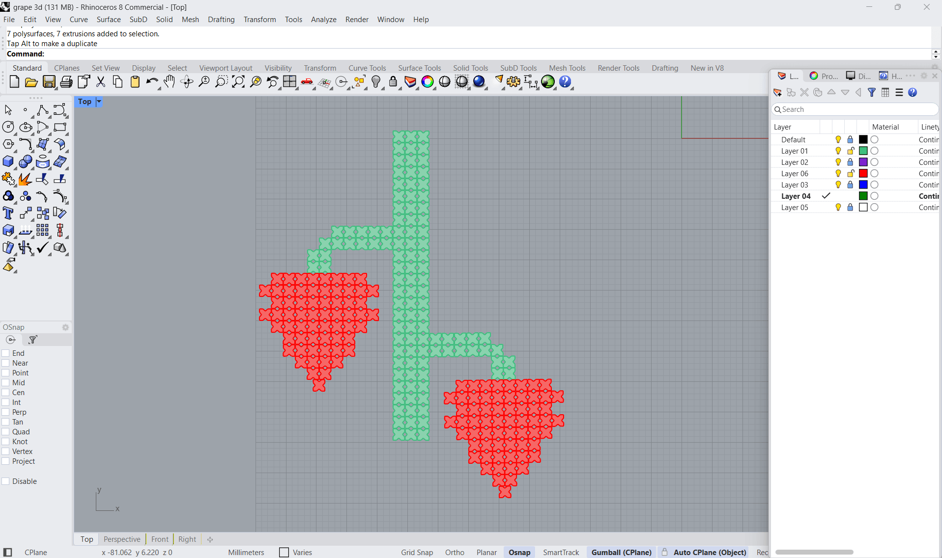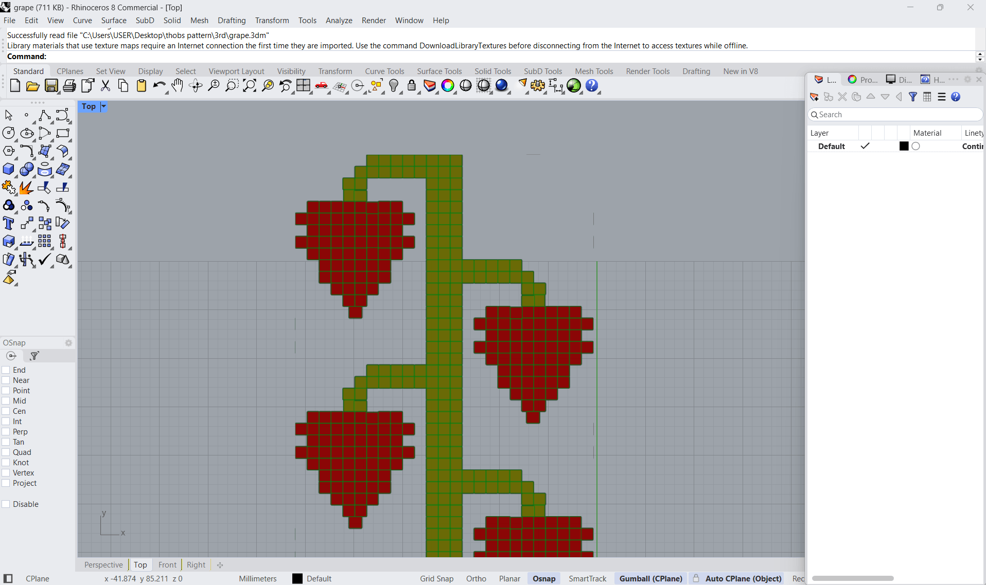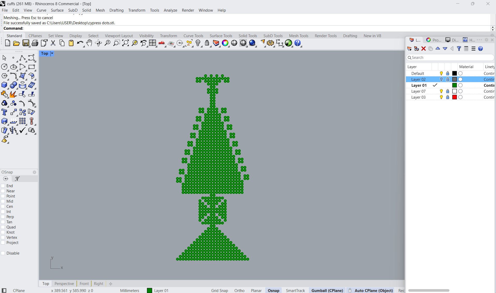 then I moved to rhino where I prerpare the dot shape that which is the first unit shape that I plan to use in Tatreez and the grid and the final 3d model.