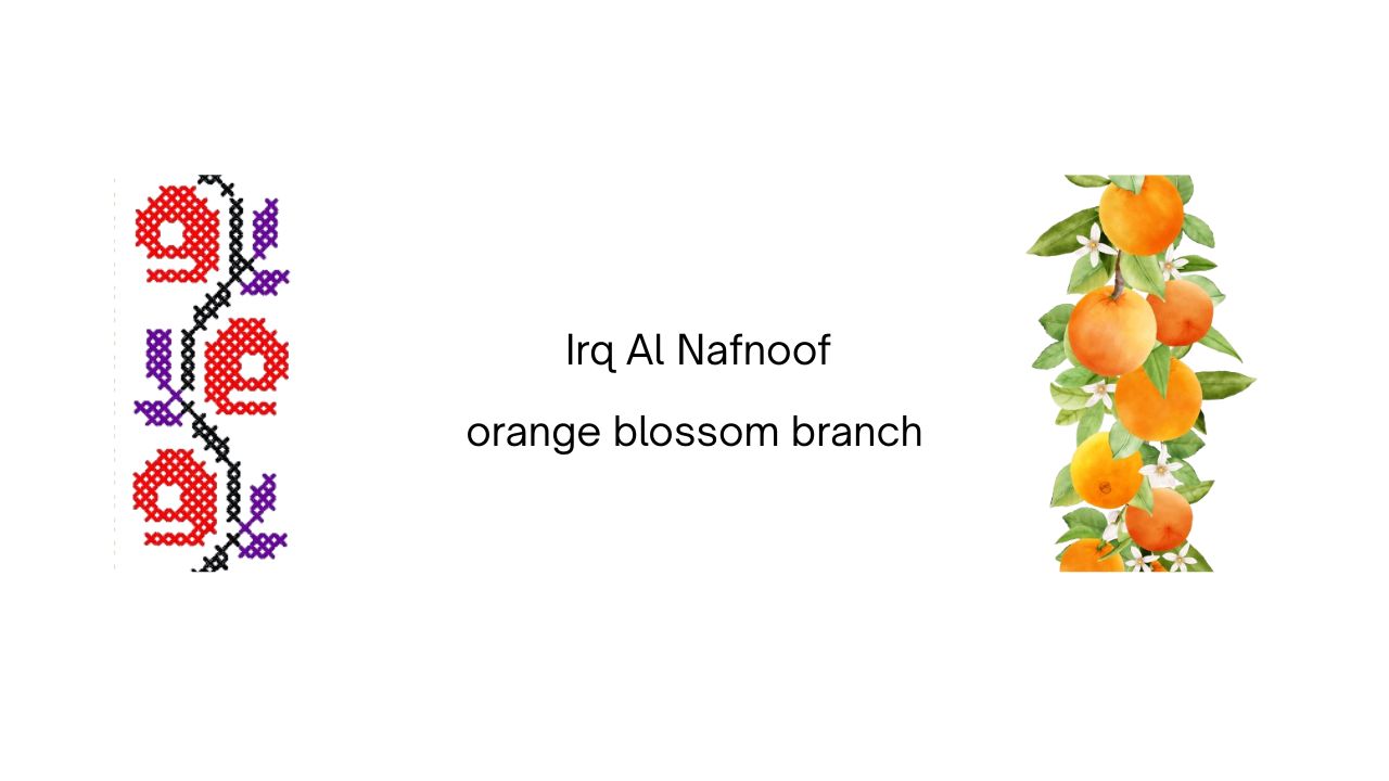 The "IRQ ALNAFNOOF" pattern is one of the most famous floral motifs in Palestinian tatreez, also known as the "orange blossoms brach".