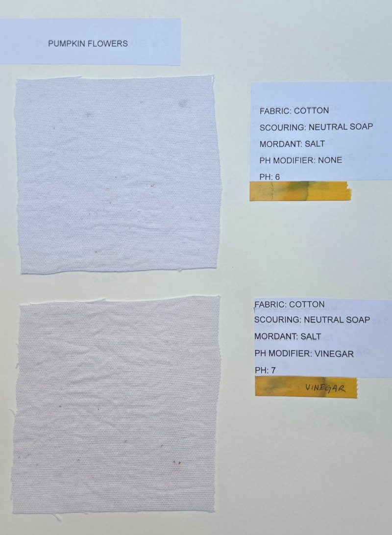 I was inspired by the natural dyeing techniques used in Oaxaca, Mexico that came from the Mesoamerical culture. I wanted to test how to dye fabrics using pumpkin flowers because is considered one ephemeral pigment hard to make it last.References: The Art of Dyeing Naturally in Oaxaca