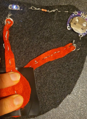 Using felt, aluminium paper and velostat, I created an analog pressure sensor (left picture) and a digital button in the right, without the velostat.