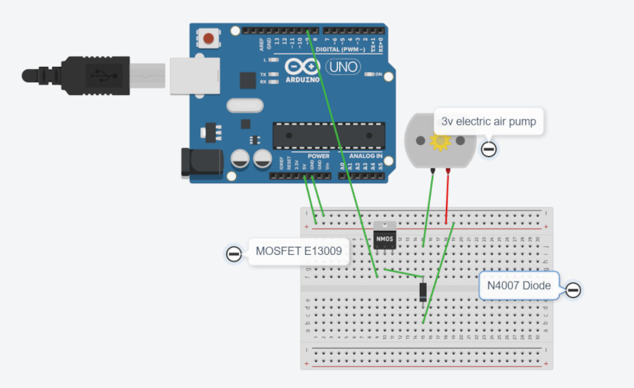 My hand drawn rabbit sketch and the circuit to control the air pump