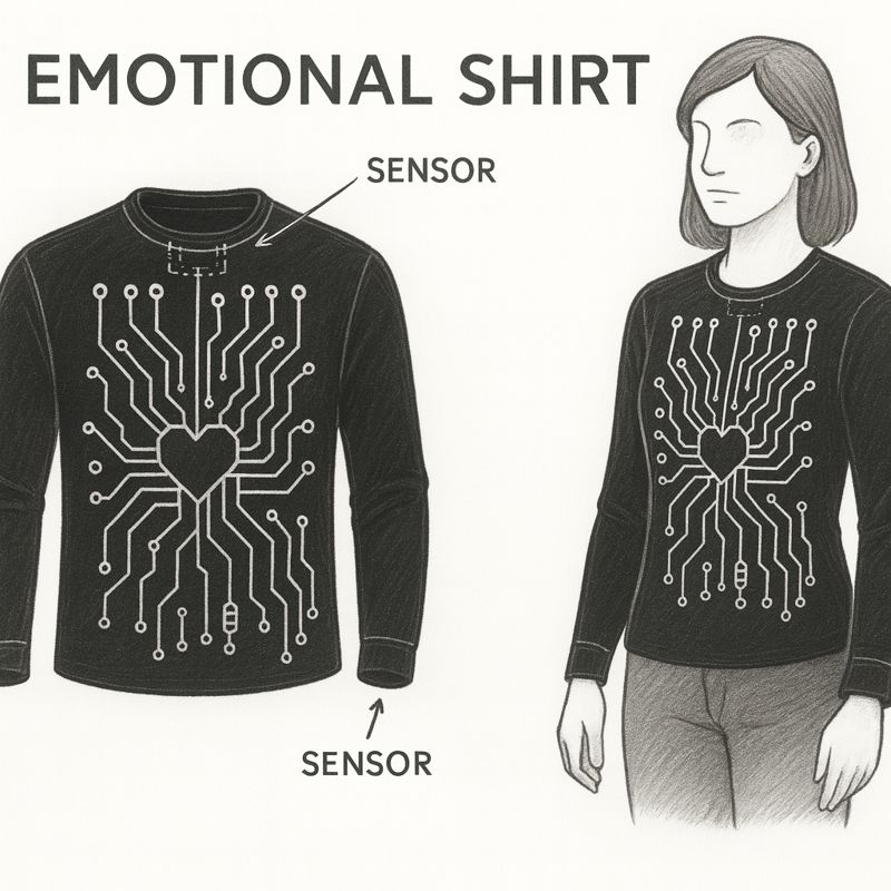The system detects physiological signals using biometric sensors and processes them through a microcontroller to interpret emotional states. Based on these readings, the garment generates a supportive reaction—such as gentle electrical stimulation, magnetic pulses, warmth, pressure, or vibration—to help improve the wearer’s mood and enhance their sense of well-being.