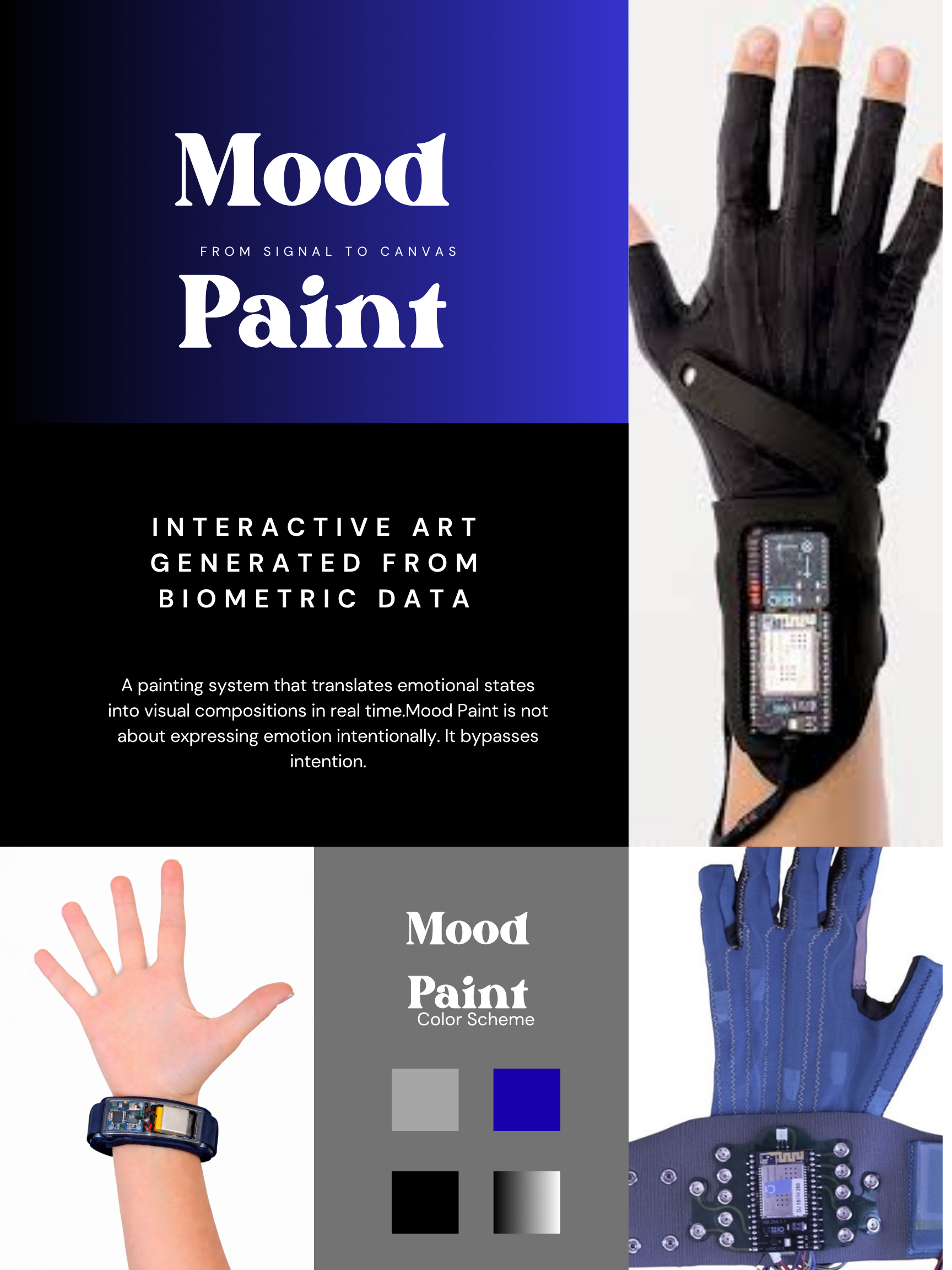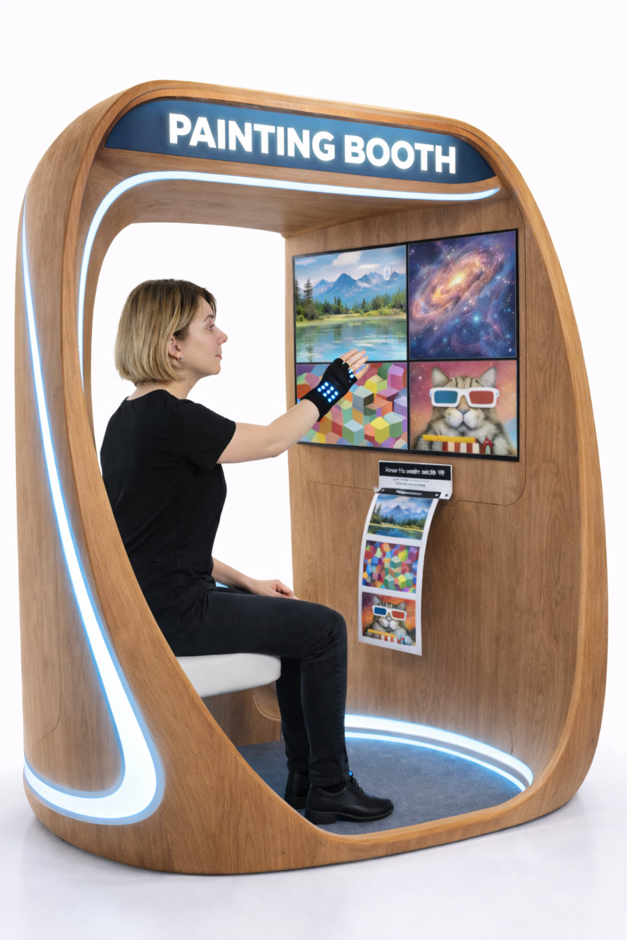 The Mood Paint experience is intended to operate in two modes: an immersive painting booth for a more intimate experience, and a gallery setup where the visuals are displayed on a screen, allowing the user to simply wear the device and stand in front of it.