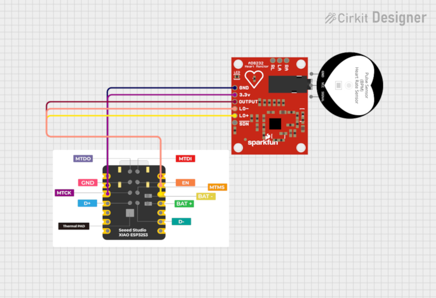 To connect the AD8232 ECG sensor to the Seeed Studio XIAO ESP32S3 Sense, you will use specific pins for power, ground, analog input, and lead-off detection. The AD8232 operates at 3.3V, which is compatible with the XIAO ESP32S3 Sense's logic levels.