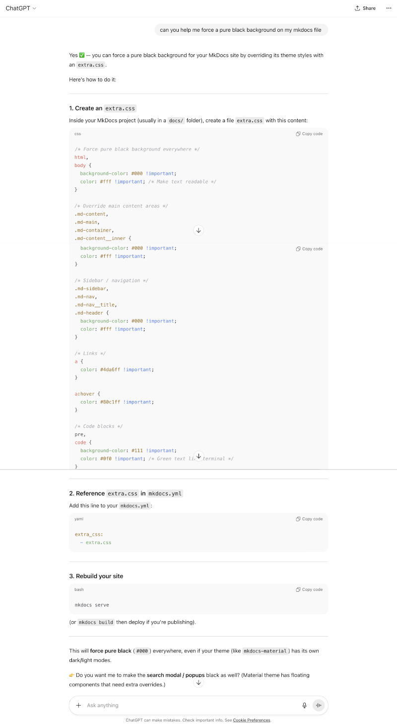 I was pretty happy with the general layout of the material theme, it was primarily stylistic changes I wanted to make. As mentioned prior, I experimented with background colour as well as font styles. As markdown was very new to me, I had everything to learn. I discovered that the majority of stylistic changes were made within mkdocs.ymkl so I played around with google fonts and colours there.