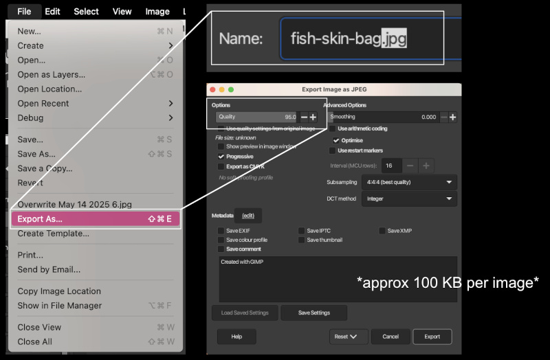 - if still not under or around 100 KB, adjust the quality dial when exporting.