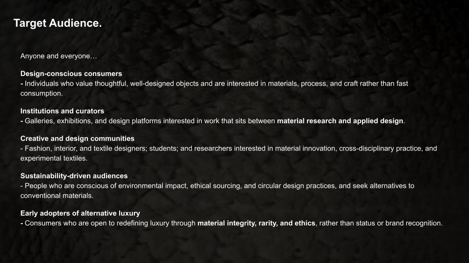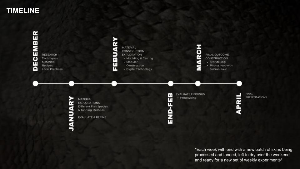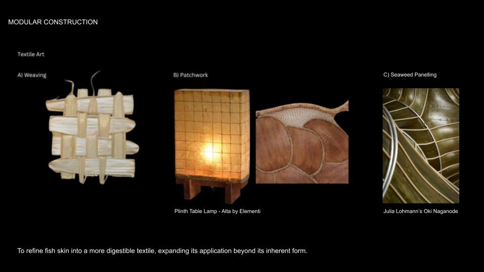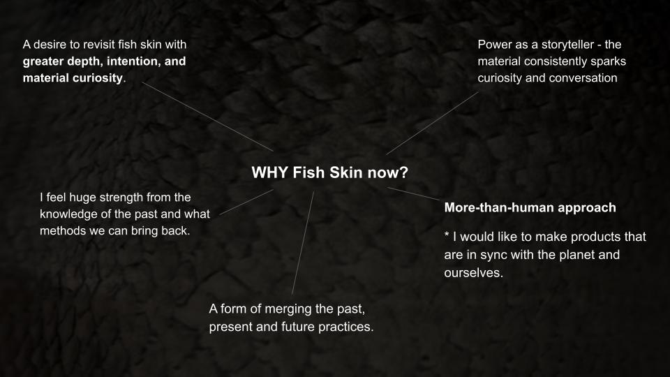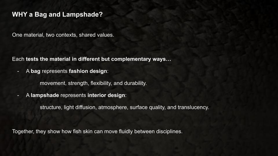 Porpla : The fish skin is very beautiful especially when it's translucent under the light. When you mentioned tracking the stories of the fish, maybe you can work on layering these fish skin for the lamp and let the translucency reveal the layers . I love the zero waste aspect as well, I am working part-time in sushi restaurant and see so much waste everyday. This is an interesting project on zero waste fashion https://www.shellyxu.design/