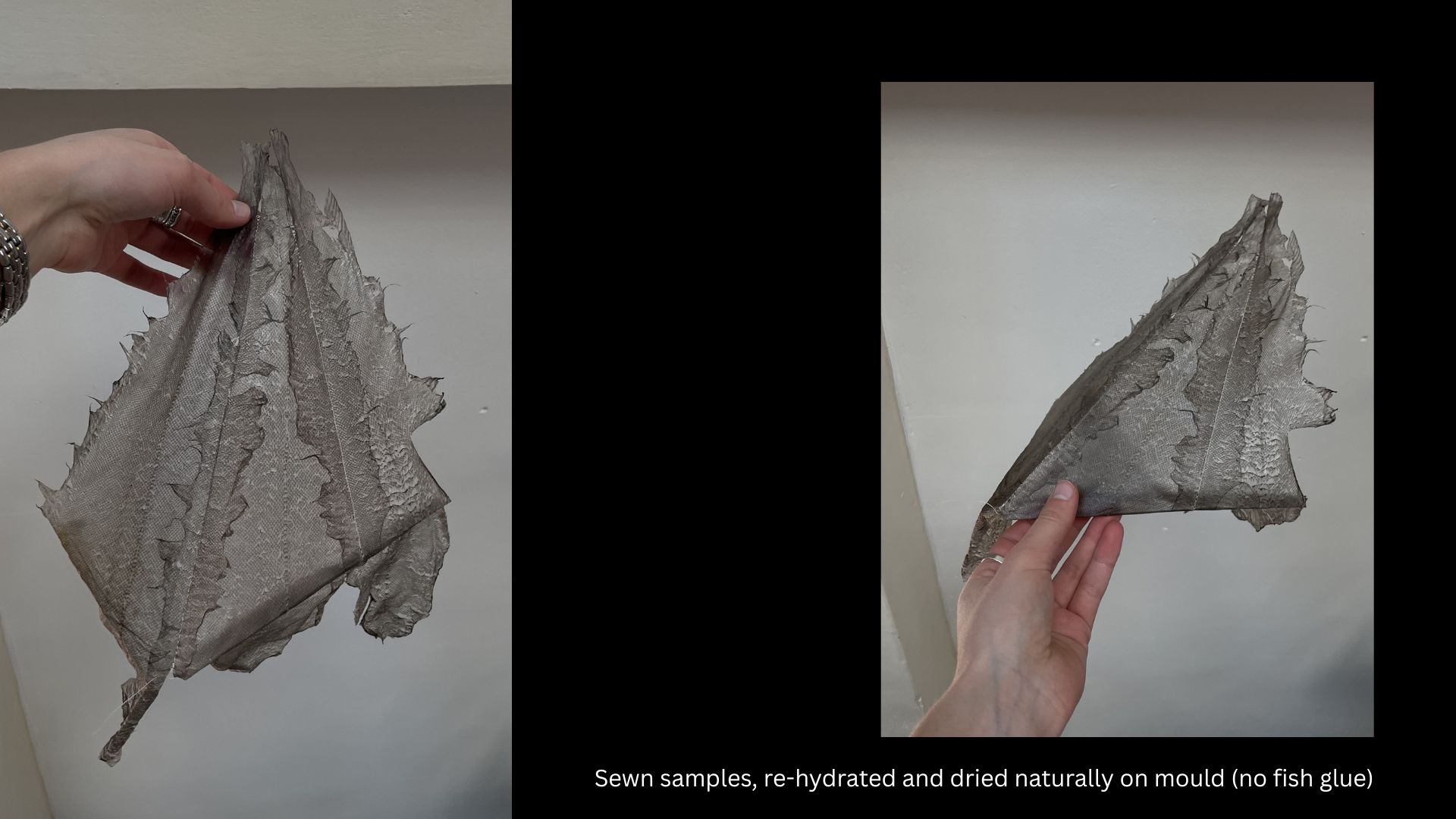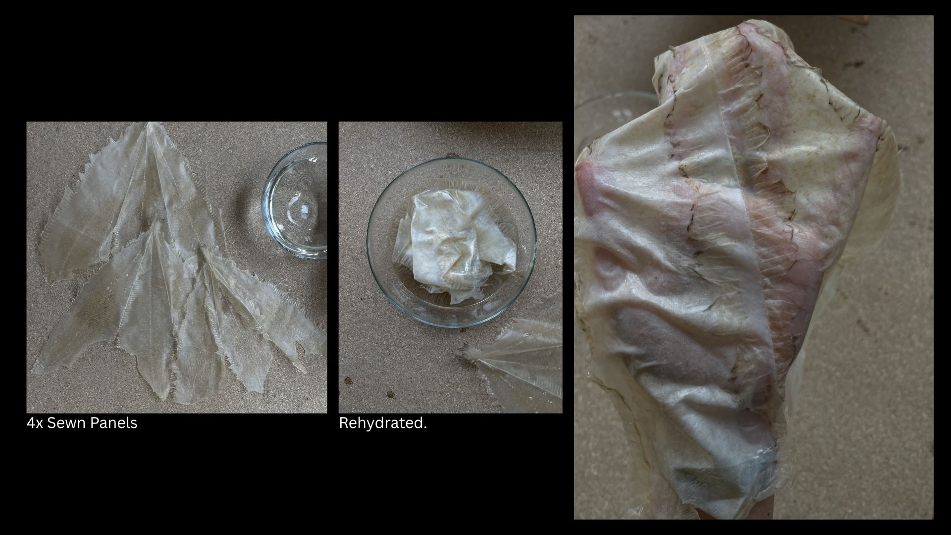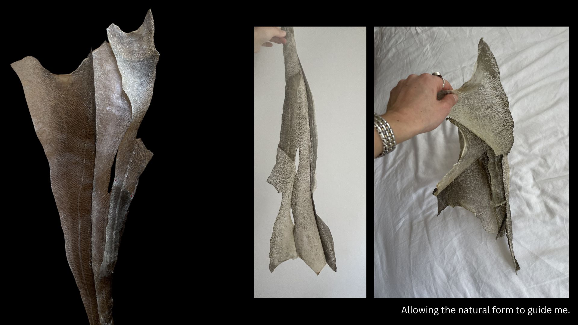 I was so happy with how this experiment turned out, in particular the Salmon. The skin gained so much more flexibility whilst still maintaining it's shape and strength. When it stretched it reminded me of fish scales or gills which I thought was very beautiful too. I look forward to testing this out more.