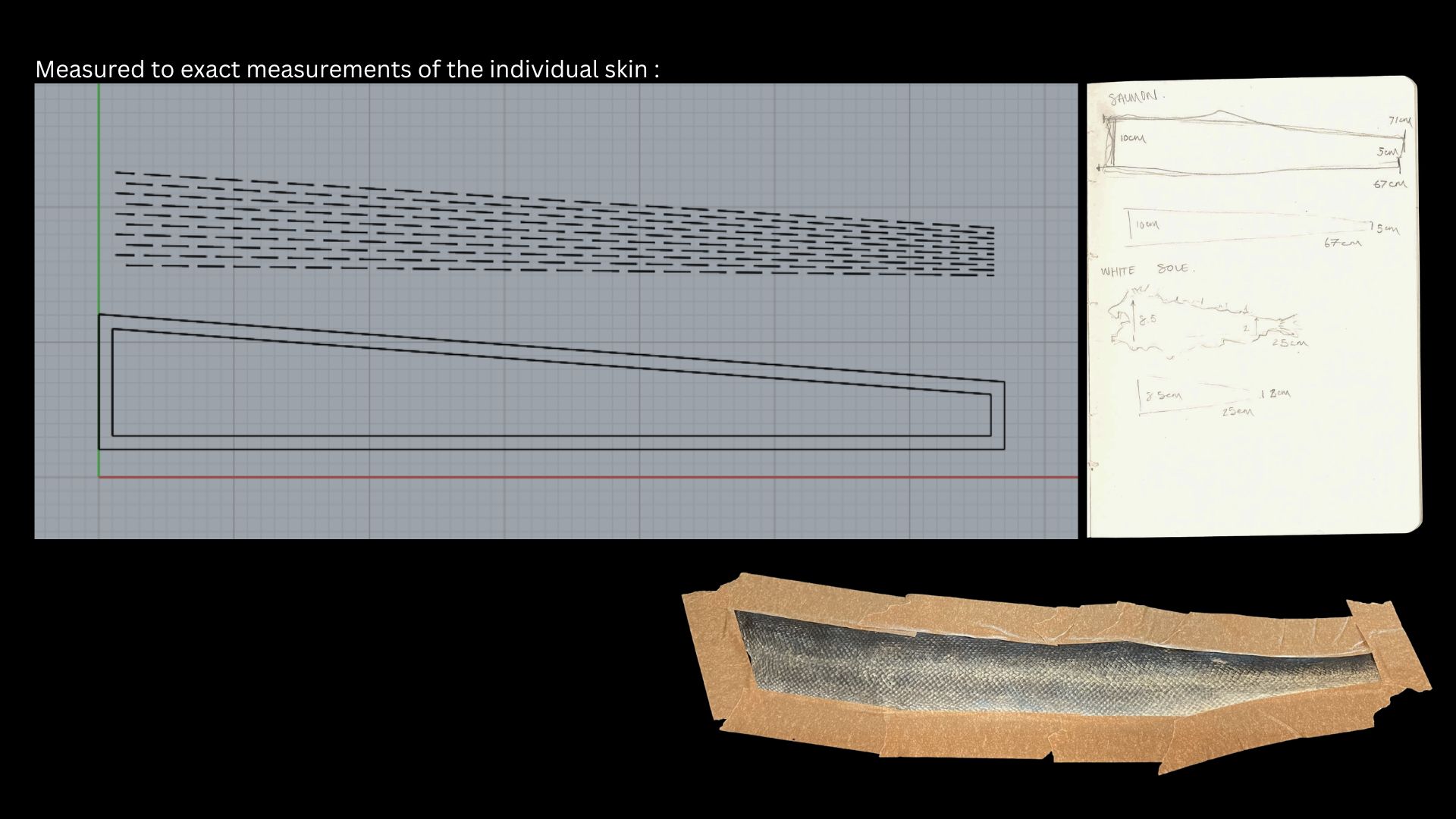This would give me a broader understanding of the fish skins potential and pros and cons of the different properties they have. This was really interesting as I had only ever worked with Salmon and it was really interesting to evaluate how the tanning methods influenced them (see spreadsheet below of my findings).