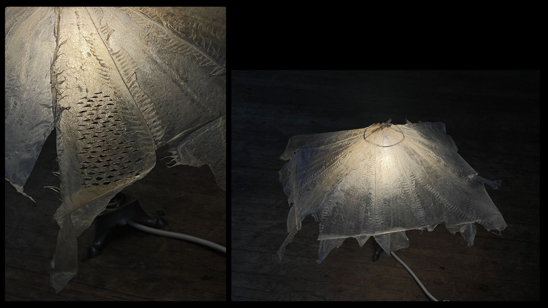 I was very happy with this prototype. It gave me a good indication of how the fish skin, fish glue and bones worked together. Delicate yet strong. The kerfing was beautiful with light however I didn't feel it was necessary for the final design. I now had to think about how I would attach the shade to the lamp base without blocking the light.