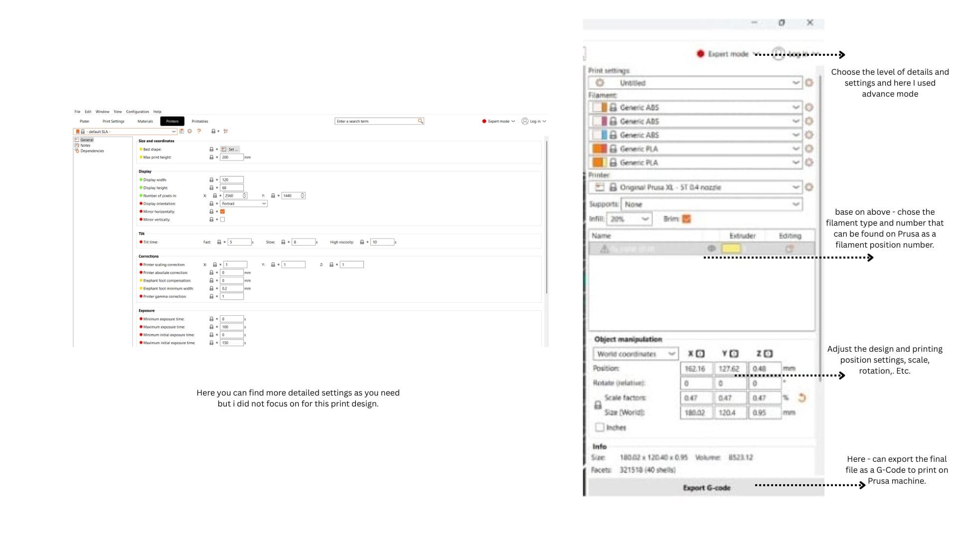 On prusa it is not hard but here only used a default settings with slightly change on filament number based on the filement position on machine,as you can see on the right side. remamber that Prusa software too take stl file and exported to machine as G-Code.