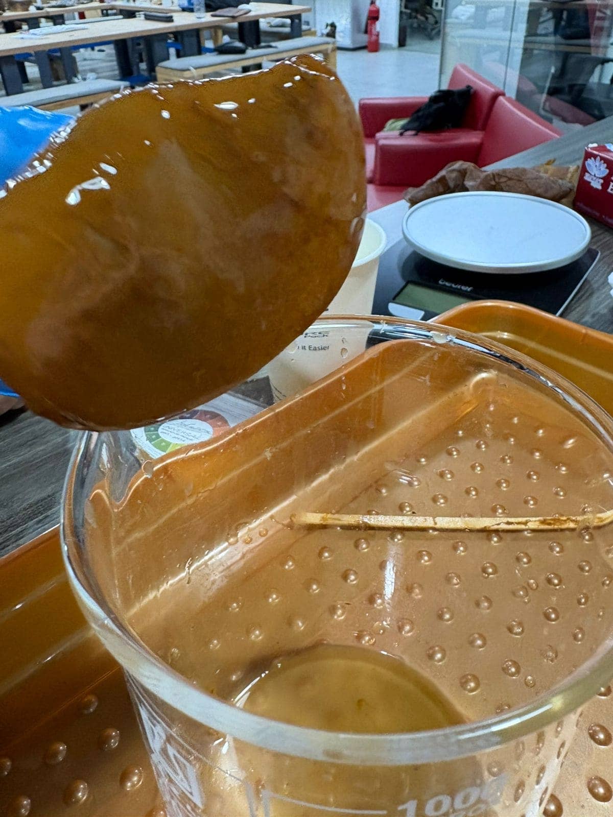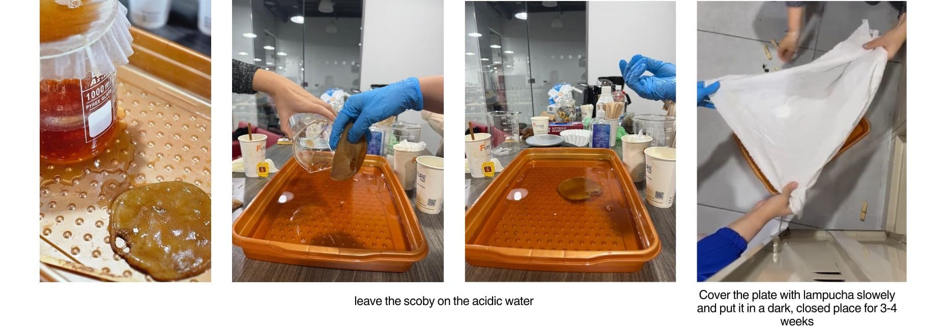 Needs to wait for this mother kampucha to grown in the tea water made previously -following the ingresient above "grow fabric in kichen" it could need 3 weeks or a month to be fully grown and ready to be used . it will be used in scaffoled week