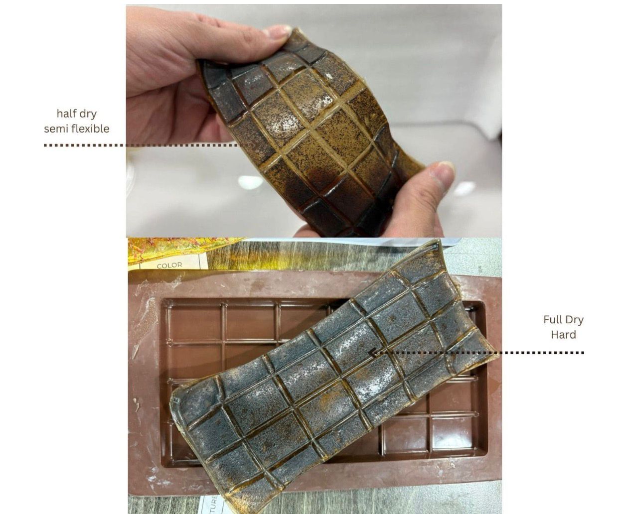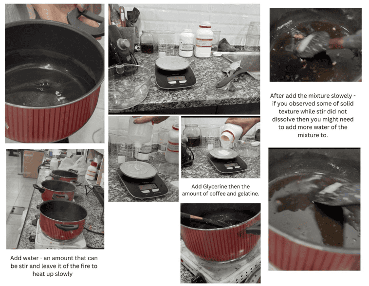 | GELATINE 48g | GLYCERINE 12g | WATER 240g | Coffee Ground 3g( or more) | It can be semi flexible when it n not 100% dry and hard when it is fully dry |