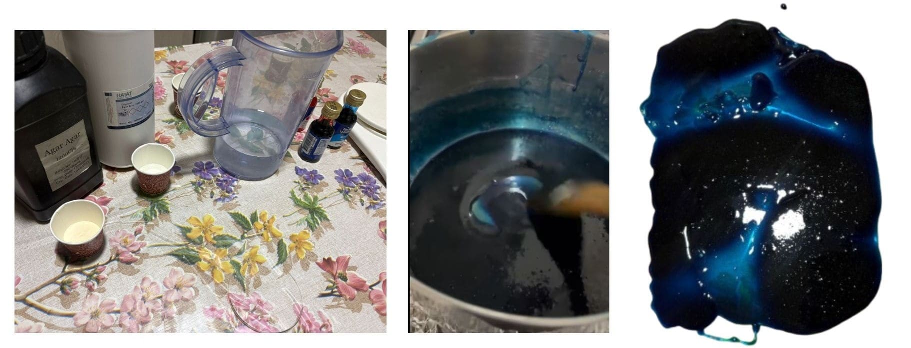 | AGAR AGAR 5g | GLYCERINE 15g | WATER 250g | FOOD COLOURING 1g | Flexible material |