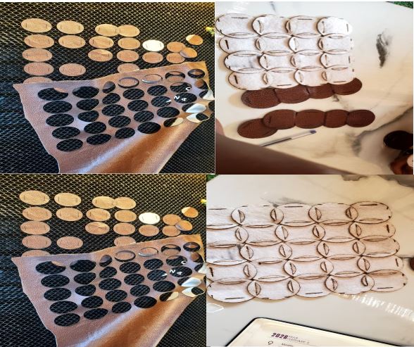 The laser-cut layout was created using coreldrow. I optimized the nesting to reduce fabric waste and ensure efficient material usage. I arranged the modules tightly and aligned them to minimize cutting time and fabric loss supporting circular and zero-waste principles and i have gone to finall which is cutting