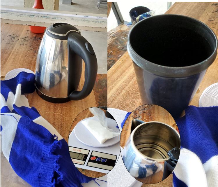 . Boiled water: 1 liters (already prepared). 𖡎. Alum (aluminum sulfate): Use around 150-200 grams per liter of water. . piece of knitted material 𖡎. plasit contain to hold water . scale . kettle to boil water