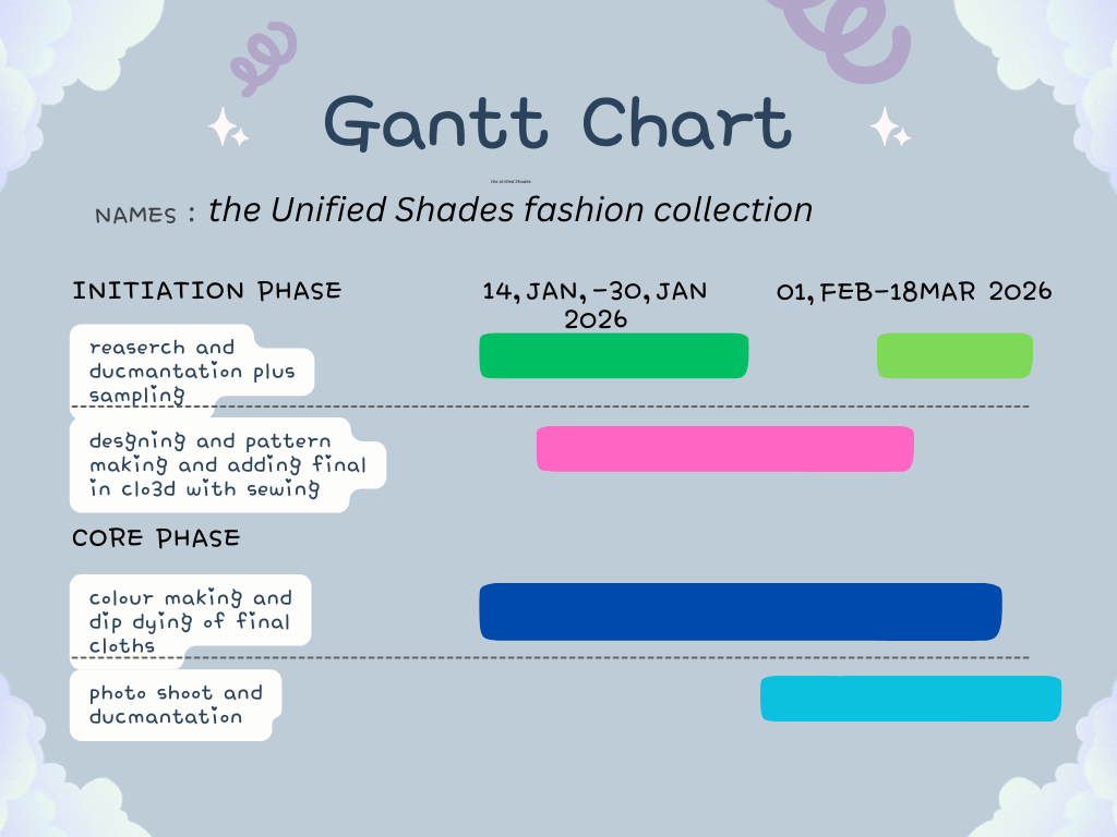 This Gantt chart illustrates the structured timeline for the development of a six-outfit fashion collection made from linen fabric and dyed using natural dyeing techniques. The project runs from 14 January 2026 to 23 February 2026 and is divided into clearly defined stages to ensure an organized and efficient workflow.