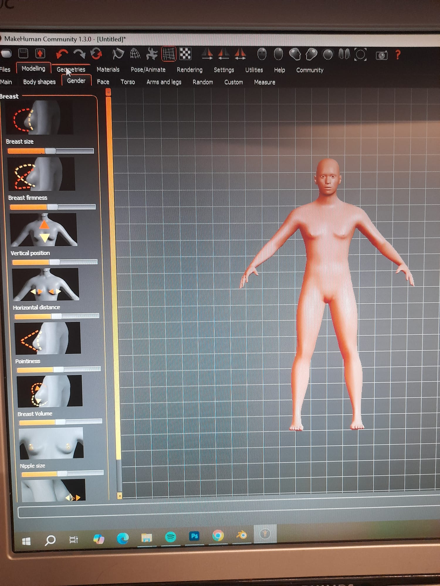 To make the model more precise, I used the Measurements tab in MakeHuman to check and adjust: