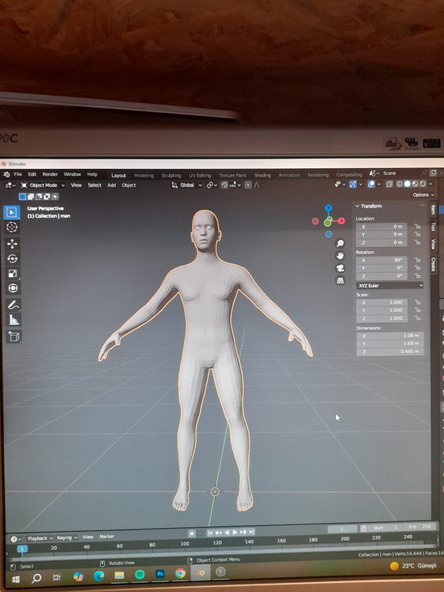 This gives a clear idea of the physical dimensions and helps to compare the final object with the reference measurements from MakeHuman.