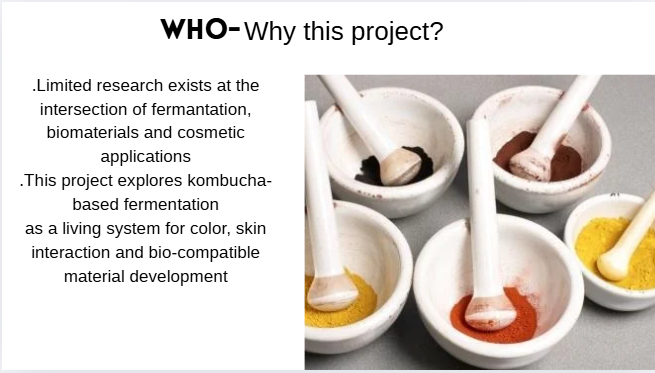 This project sits at the intersection of fermentation-based biofabrication, natural pigments, cosmetic material systems, and skin-contact applications.