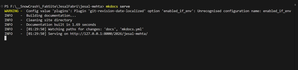 glightboxwas not installed, and that threw errors locally. I installed it from the terminal and it worked out fine.mkdocs-git-revision-date-localized-pluginwas a different version in the original requirements.txt so I updated the mkdocs.yml file locally, but then the online version threw errors until I updated the requirements.txt and synced it. In hindsight, I should have just updated the local version.
