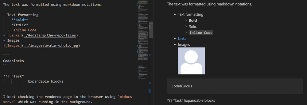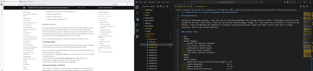 My website workflow is mainly writing the markdown text, linking images and files, etc in VSCode, with MKDocs installed, while checking the outcome in the browser using the mkdocs serve command. VSCode has a built-in markdown viewer but it needs to split the screen and I was happier with the server. I also have a second screen attached so it is easier to have one screen for VSCode and one for the browser render.
