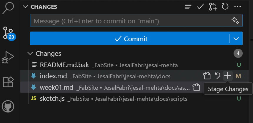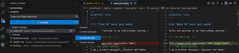 Once I was done editing, the Source Control Sidebar in VSCode showed me the changed files. I kept staging individual files since I wanted to commit them separately and keep the changes well organized, added the commit messages, and ran the sync-and-push command.