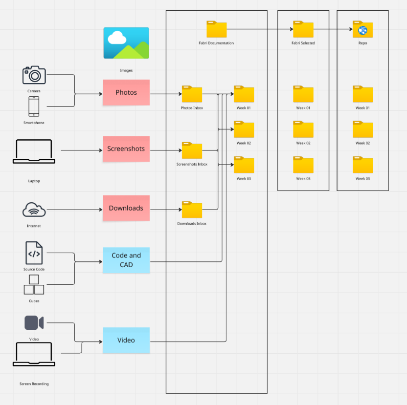 - File dumps from the windows screenshot folder, cellphone/camera image transfers, and various other sources are brought to the Working folder that will collect all data related to Fabricademy.