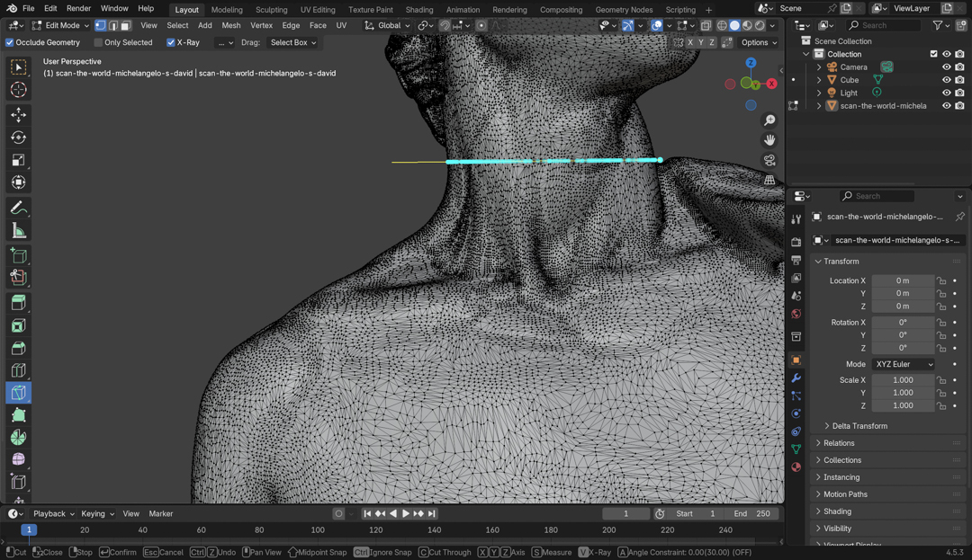 Initially, I tried to manually just do a rectangular select and delete the mesh points that made up the body. However, due to my inexperince with Blender, I did not use the correct selection options, so I ended up selecting only the visible points and deleting them. As a complex and highly detailed scan, the model has a gazillion points. I tried this several times, leading to a rather ragged model, but could not get a clean edit.