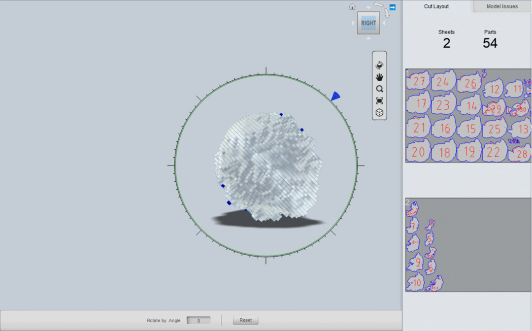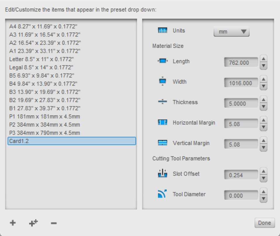 When I setup the material properties, I used the stock sheet size I had as the dimension. However, since I wanted gaps between the slices, I set thickness to 5 mm, while my material was actually 1.2 mm. This would result in 1.2 mm material + 3.8 mm air gap between consecutive slices.