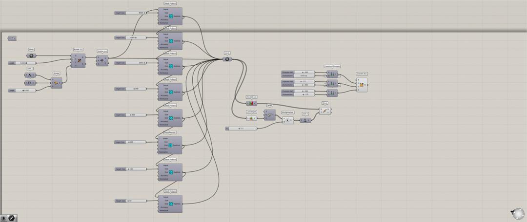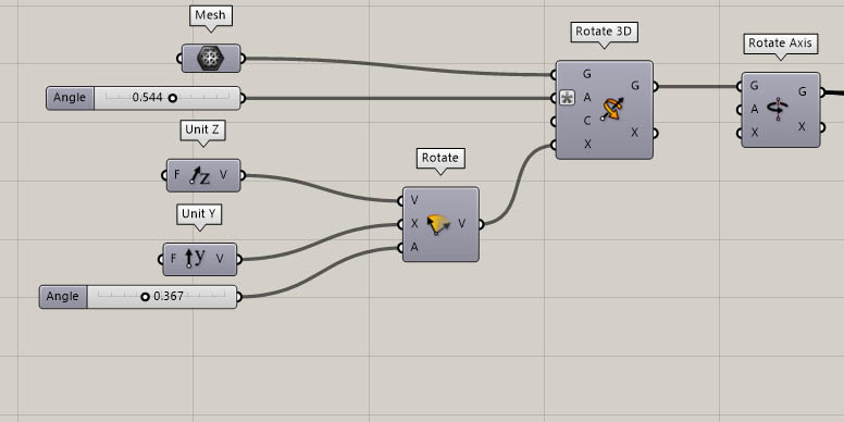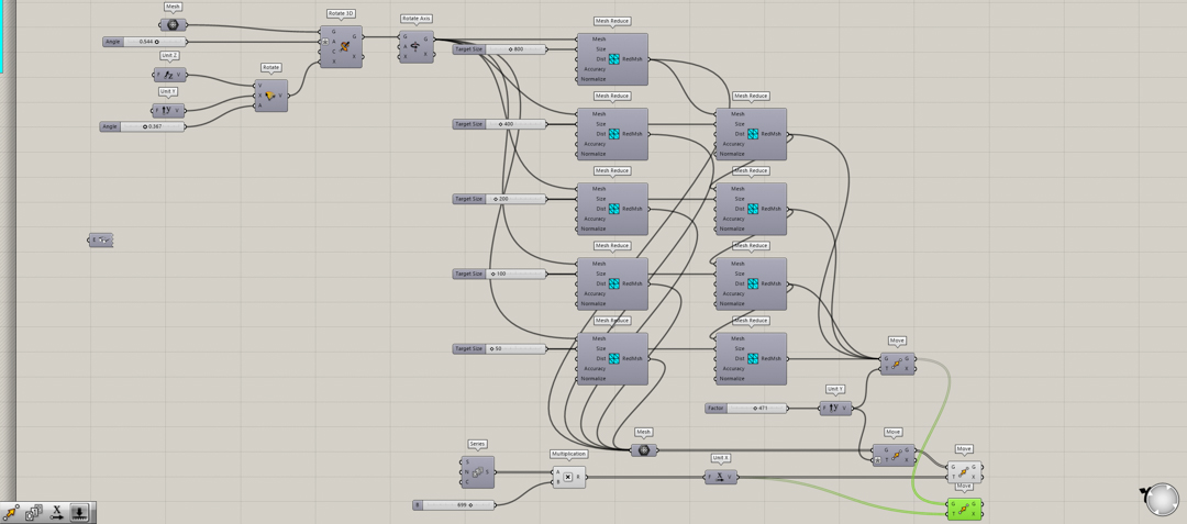 The default directions the STL was aligned to were obviously not aligned to the principle axes. Since it would be very erratic to keep rotating the model by small increments around multiple axes, I setup a Grasshopper script with 2 rotations linked to a number slider to be able to manually but smoothly rotate the model. I then aligned the 3d scan to the regular front-top-side views.