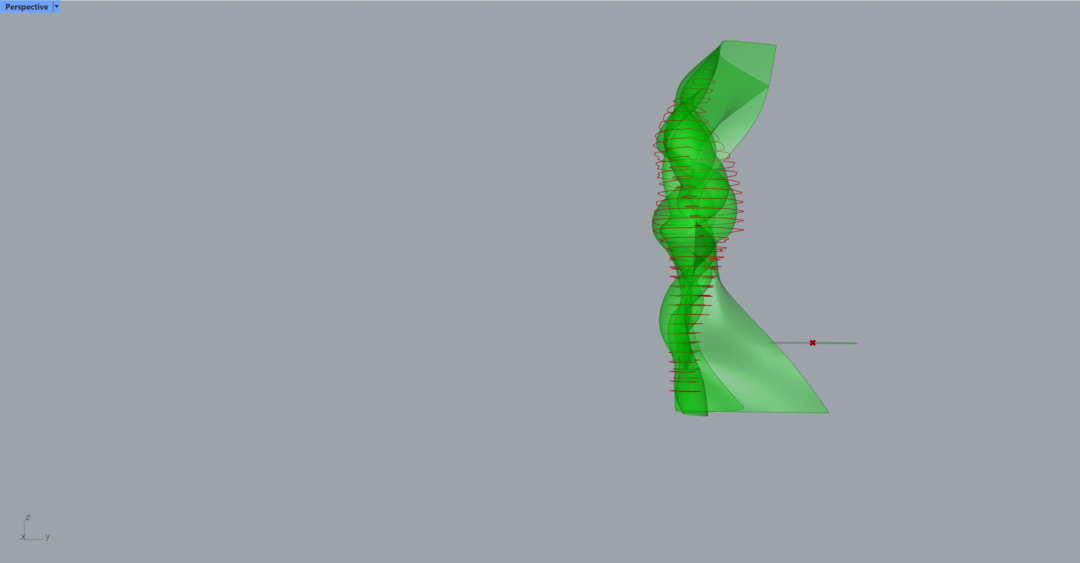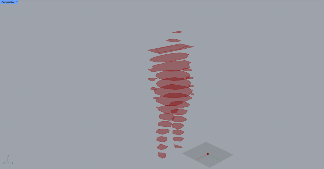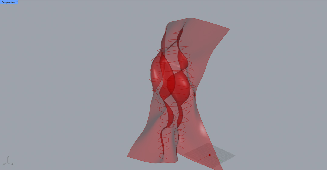 I also used the IsoContour function to create contour lines. Then I tried lofting the lines into an open surface. It does not look like anything in particular from the front, but from the side where the transparency allows it, an abstracted and smoothened contour of the body shows up. It is a very interesting result that I want to deconstruct later.