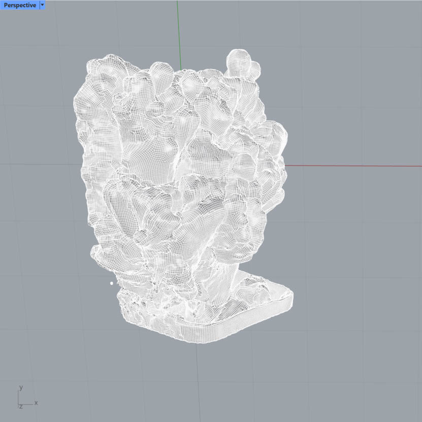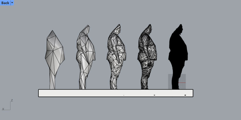 I had imported the 3D scan of myself into Rhino + Grasshopper for "Becoming". Once the mesh was decimated and the number of vertices reduced to a manageable level, I went exploring what Grasshopper could do with this model.