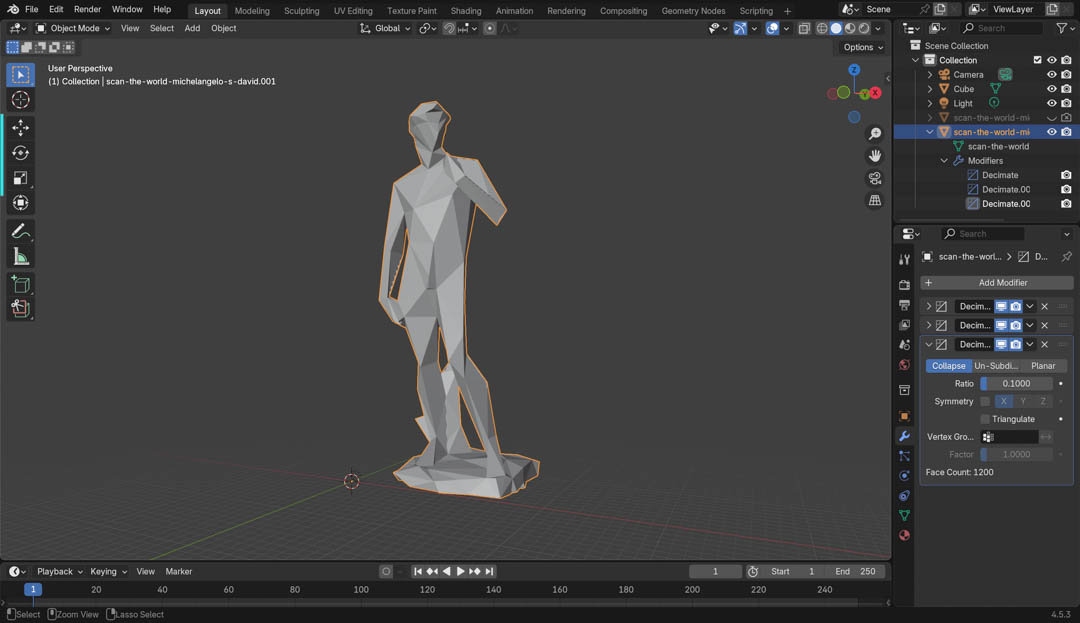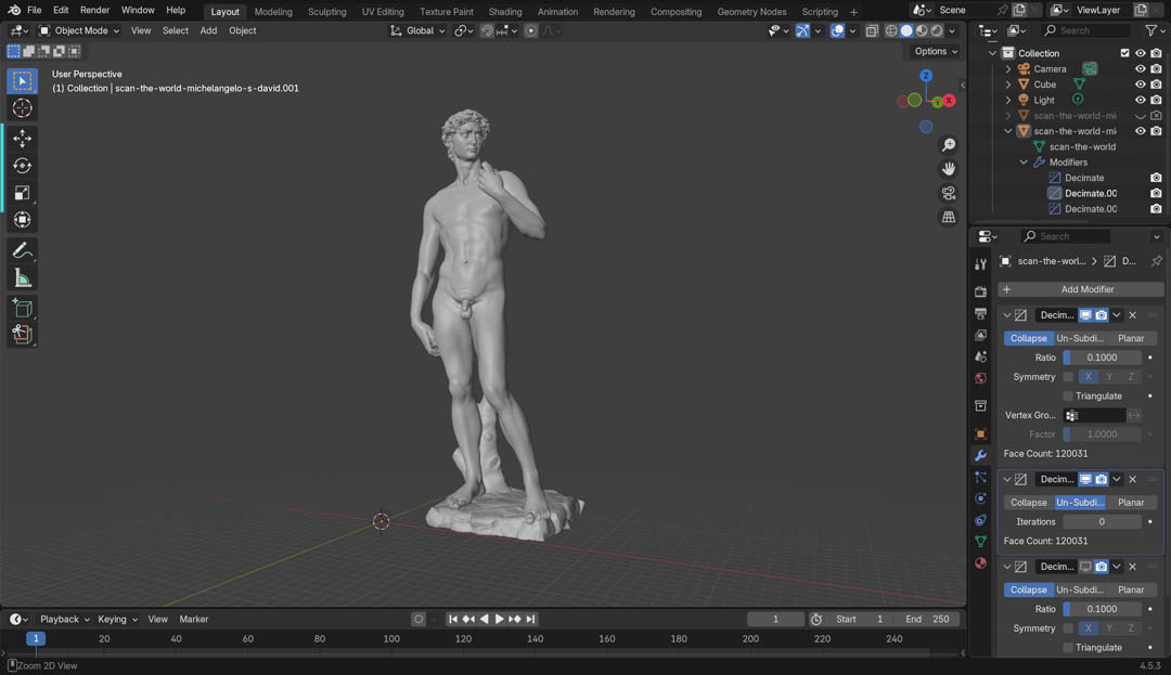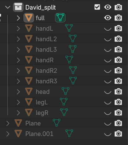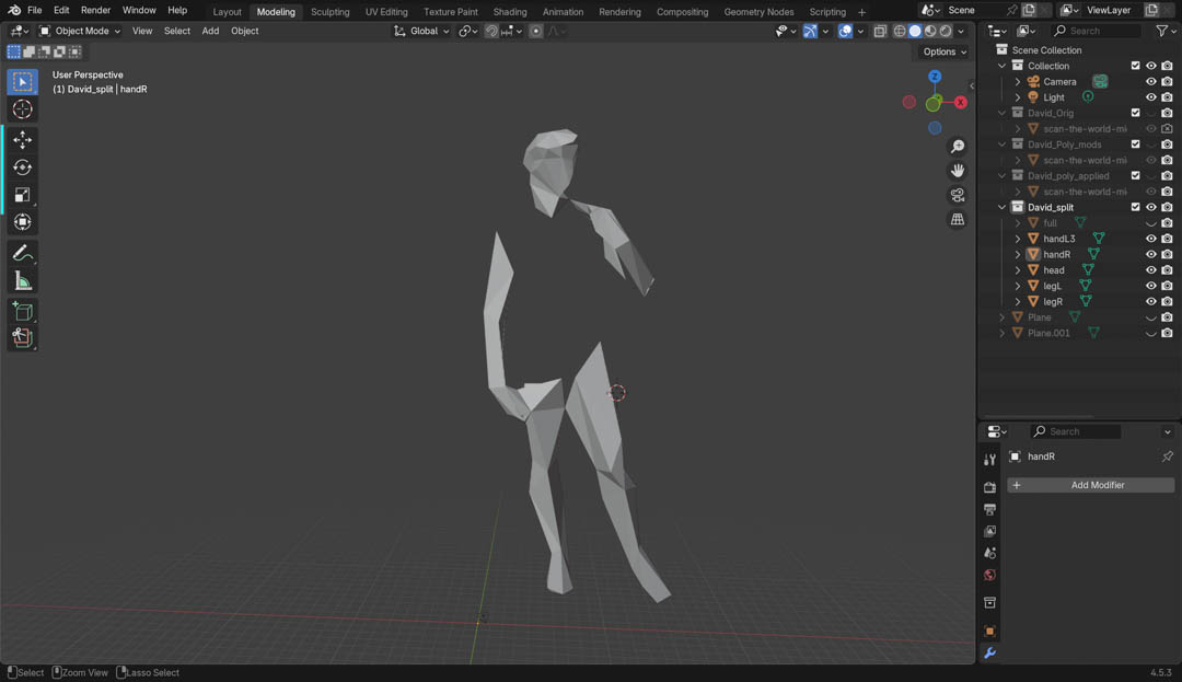 Once I knew my way around Blender somewhat, I explored turning David into an "action figure" by separating the limbs into individual bodies.