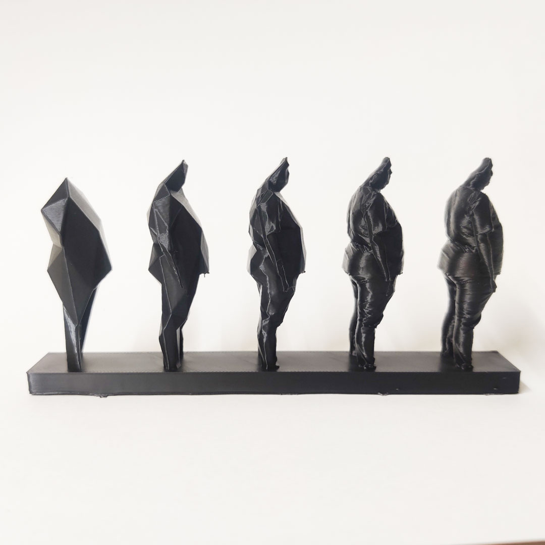 Due to the print issues, I needed another print. At that point, I realised I could rotate the figures to face the right in a callback to the Evolution graphic we are so used to seeing, since that works very well with my concept. In doing so, I chose to not do the 9 figure sequence but continue with 5 instead.