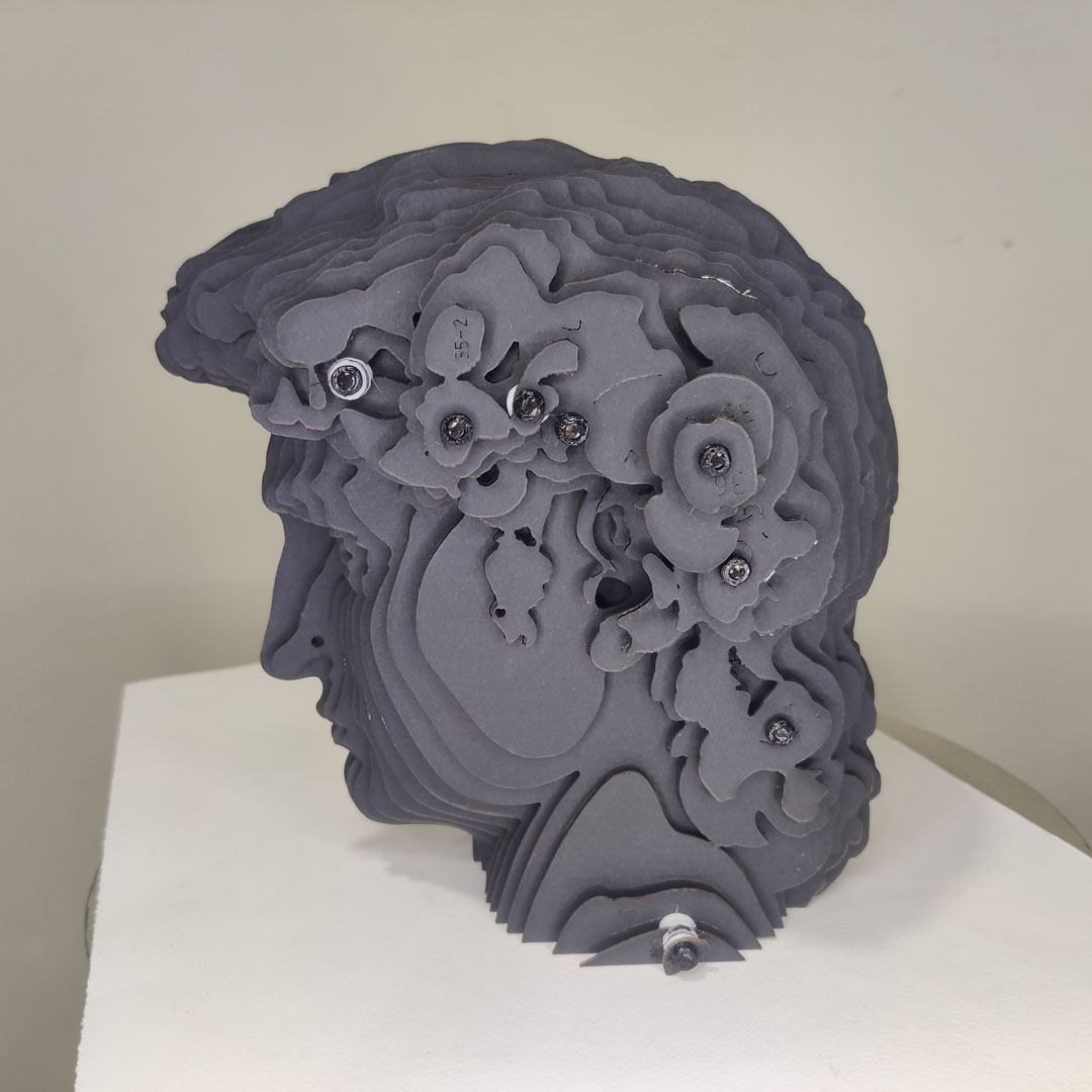 I decided I'd use Slicer to make a model of the head. However, the basic stacking build up, as well as the cross-member method, I had done several times in the past. I wanted to push the stacking method differently for this specific effect, something like light passing through narrow canyons, with a moire-like effect when moved. I wanted the stack to be very see through but also directional.