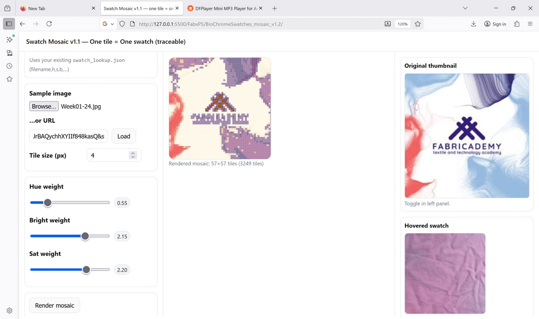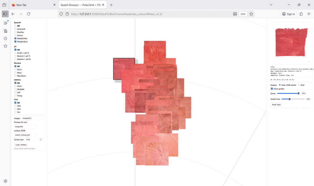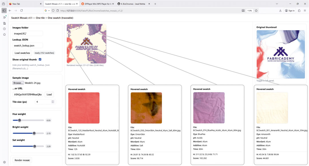 Finally, I have launched and hosted the tool as a repo on my personal Github page. Since the page also loads 2 sets of swatches, the storage required is about 20-25 mb. This isn't much for a Github page, but would absolutely mess with the Fabricademy Gitlab website sizes, so I thought it best to host it separately.