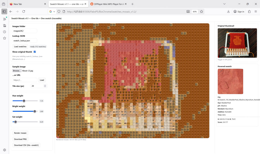 Lastly, since I could not really resist it, I used ChatGPT to generate code that would use the swatches as an image filter to apply over any image I fed the tool. It divided the sample image into smaller tiles, and matched each tile to the closest swatch piece, and then rendered a new image using the swatches as individual tiles in a mosaic.